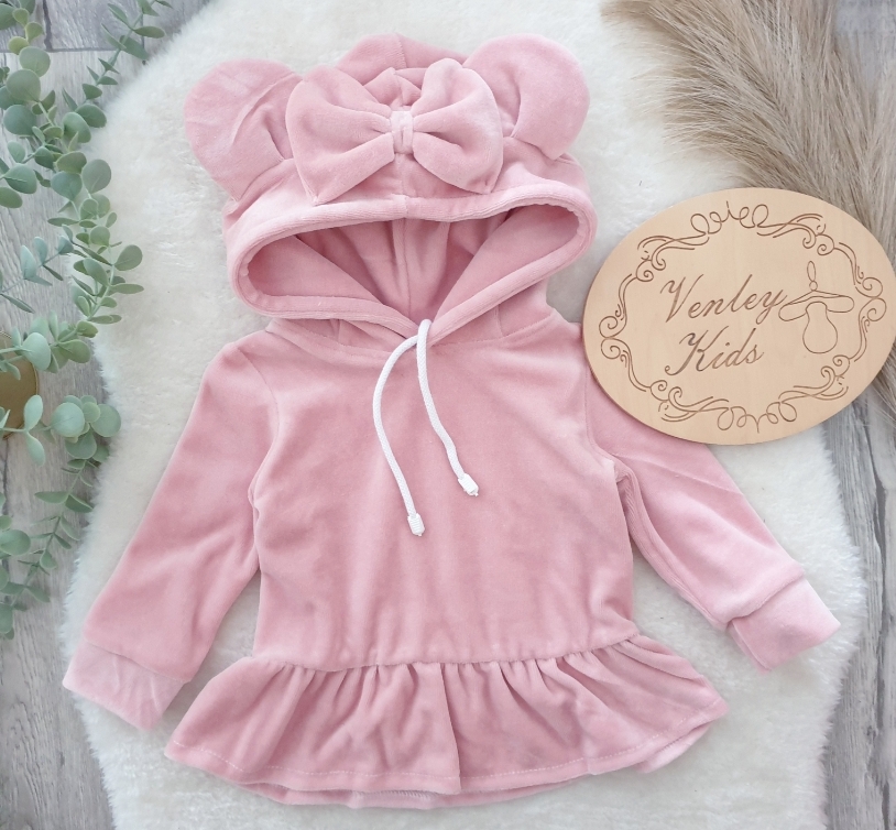 Bluza z kapturek i uszkami, pomiędzy uszkami kokardka. Dół bluzy z falbanką
