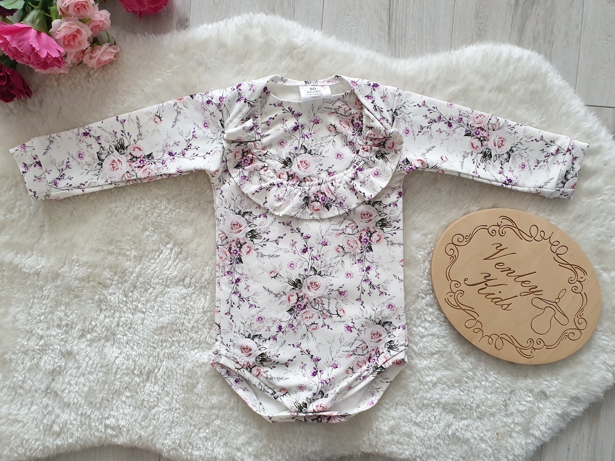 Body długi rękaw w cudowny wzór KWIATUSZKI FIOLET