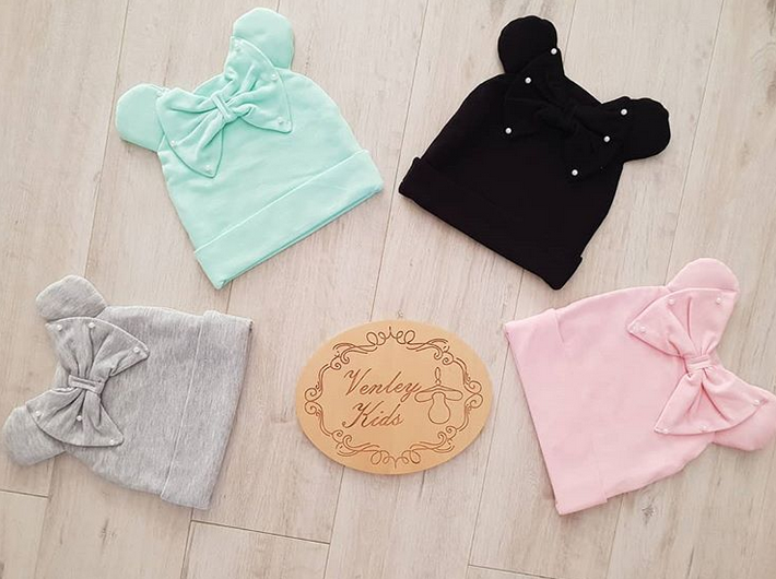 - Czapeczka szyta z podwójnej warstwy materiału ozdabiana dużą kokardką dodatkowo przyozdabiana perełkami