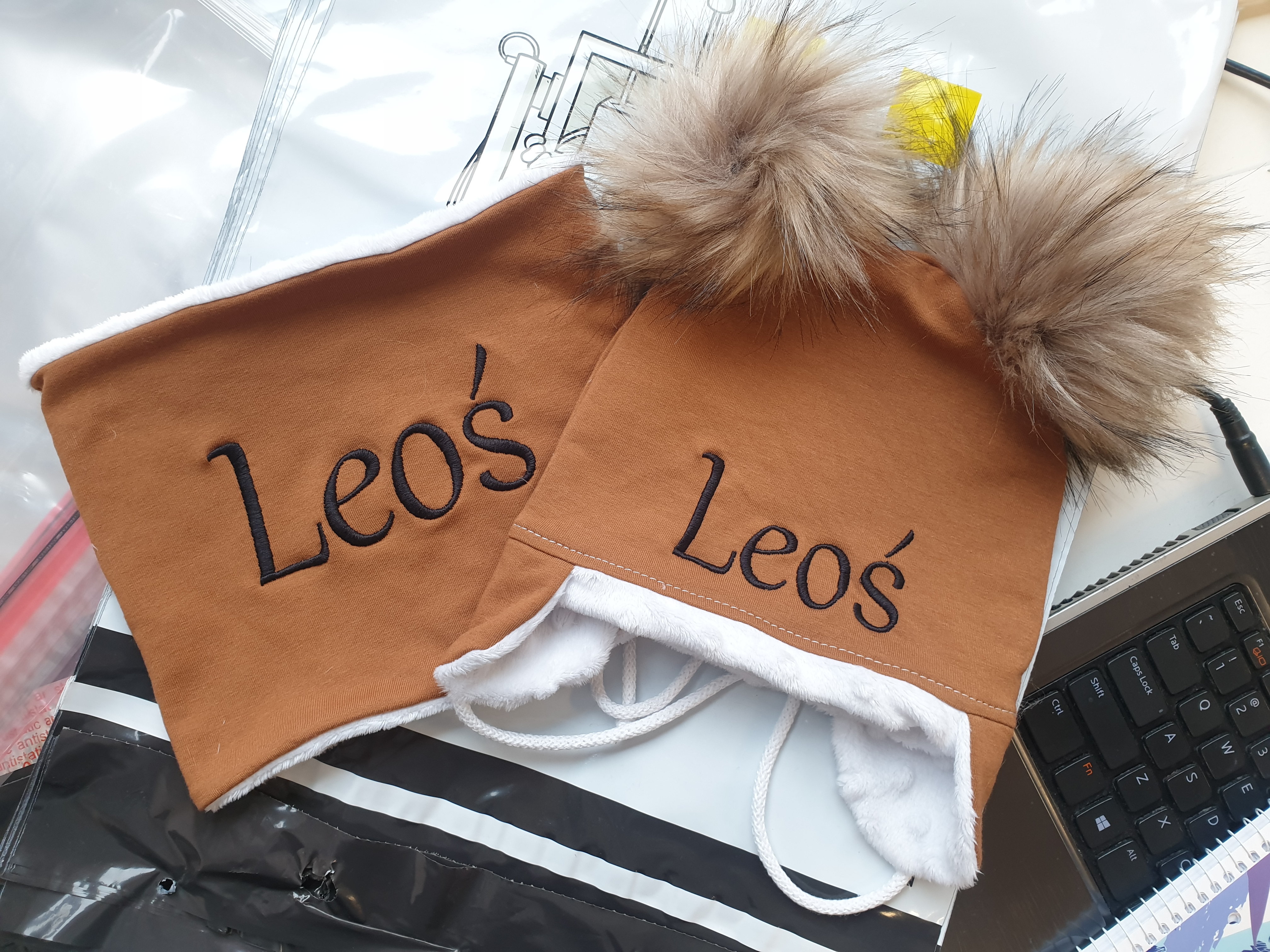 Czapeczka dresówka z polarkiem, ozdabiana dwoma futrzanymi pomponami -> IMIĘ