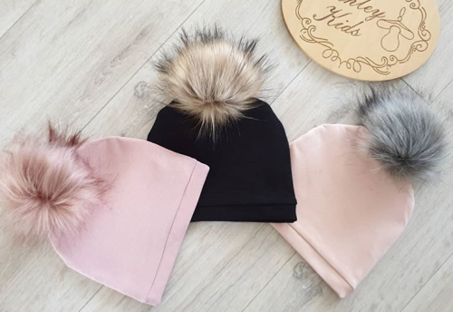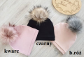 Czapeczka jesienna szyta z podwójnej warstwy materiału, z jednym futrzanym pomponem