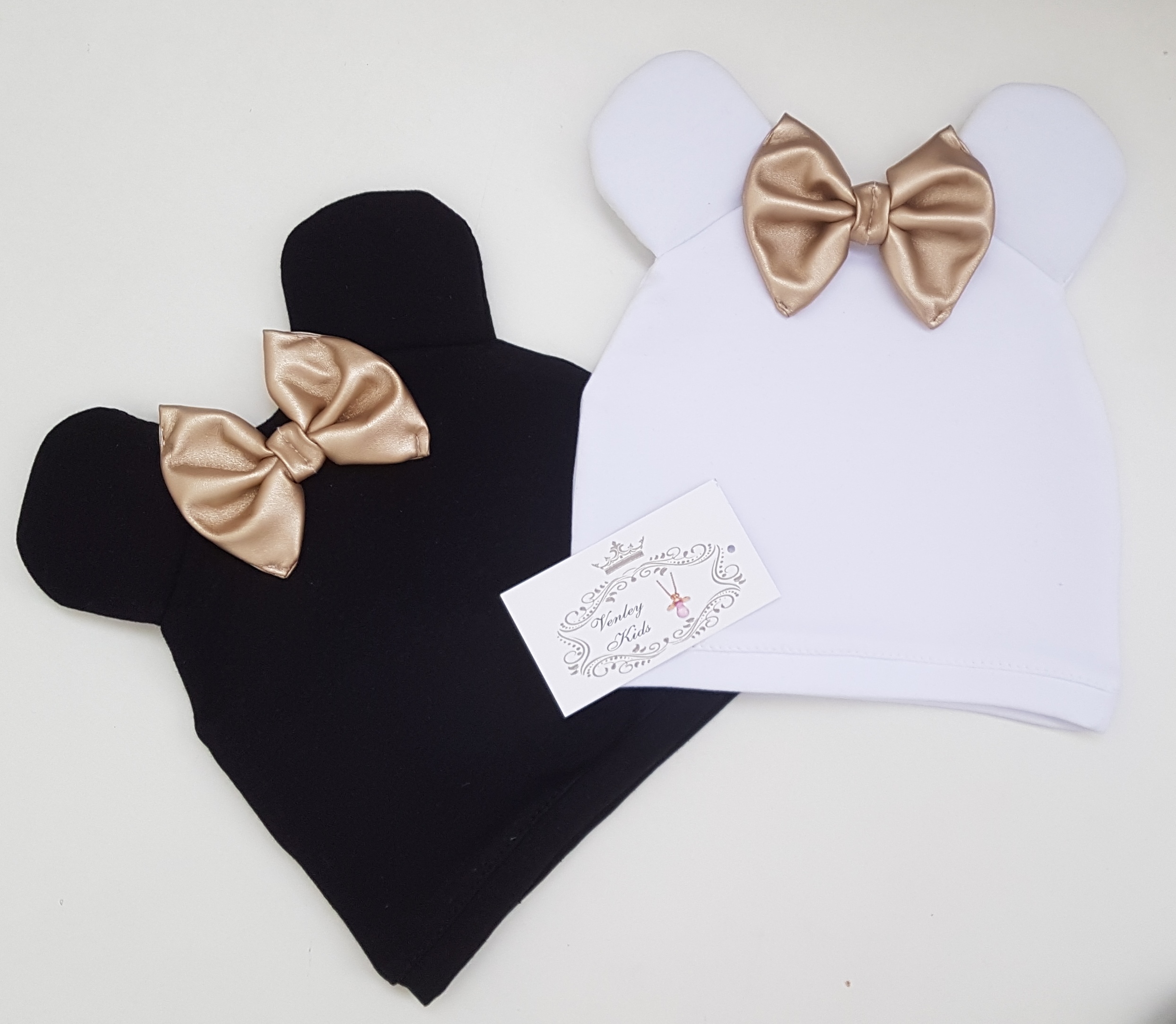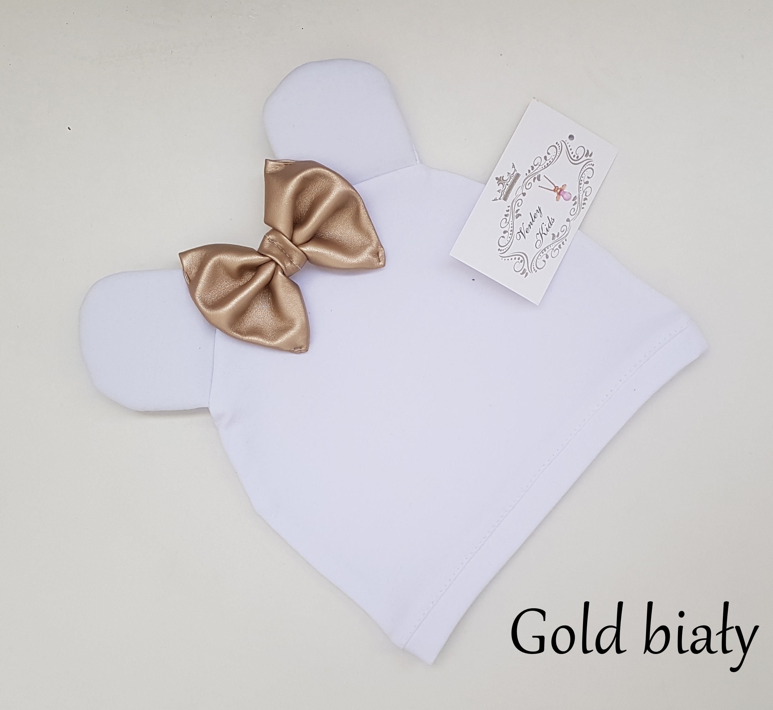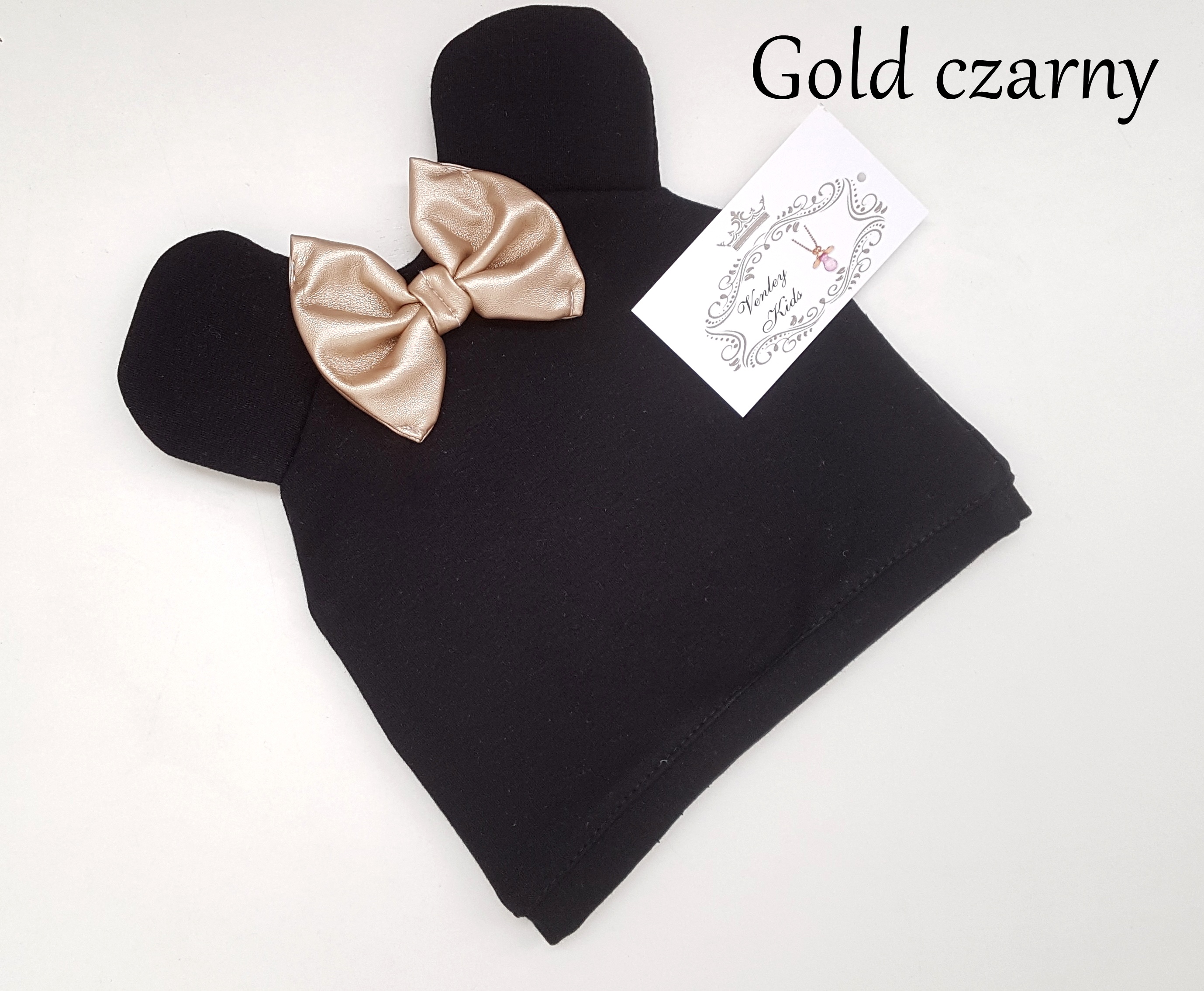 Czapeczka wiosenna z uszami MIKI, do ozdoby duża złota kokarda