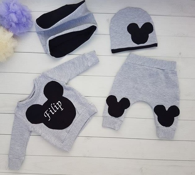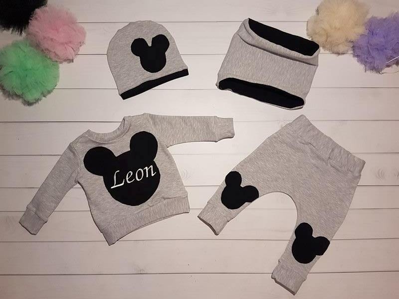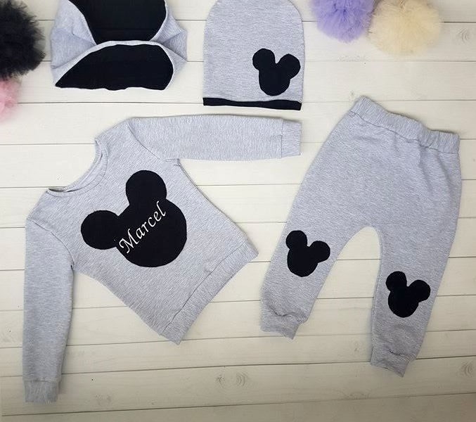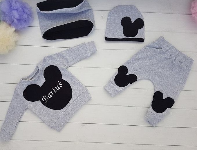 W skład kompletu wchodzi : Czapka , bluza z imieniem , spodnie, komin