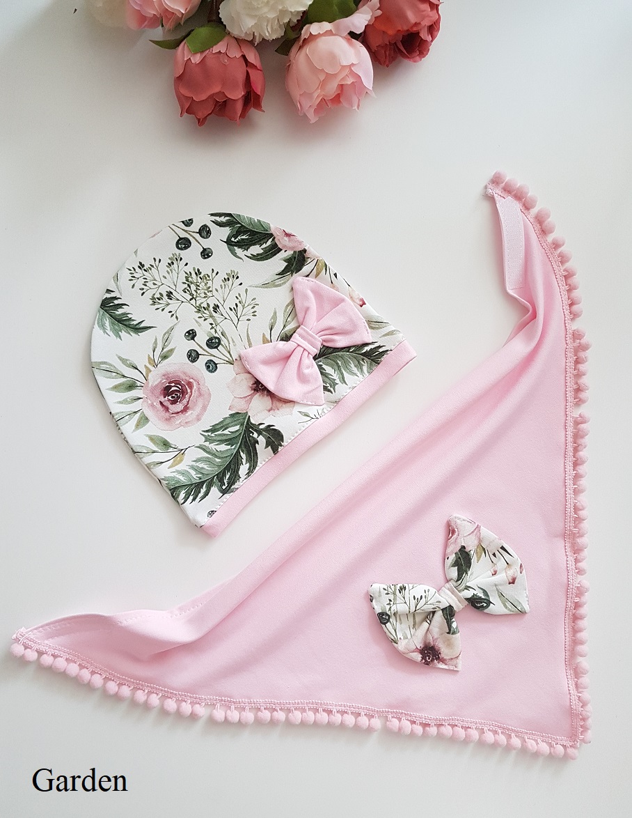 Chusta szyta z pojedynczej warstwy materiału dodatkowo ozdabiana kokardką oraz pomponikami ,zapinana na rzep