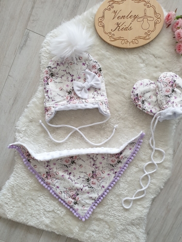 KWIATUSZKI FIOLET zestaw zimowy 3 el pomponiki