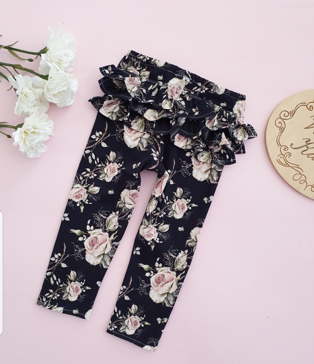 Leginsy RÓŻE NA CIEMNYM z falbankami