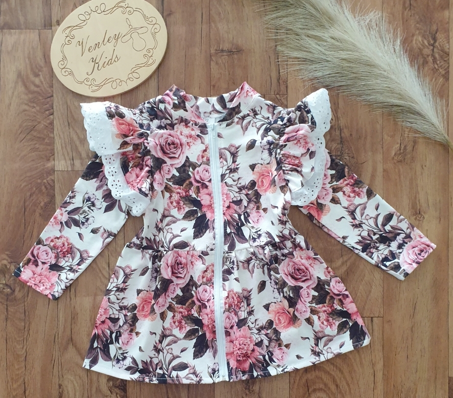 Narzutka na zamek, przedłużana ala sukienka . Na ramionach falbanka motylek ozdabiana koronką
