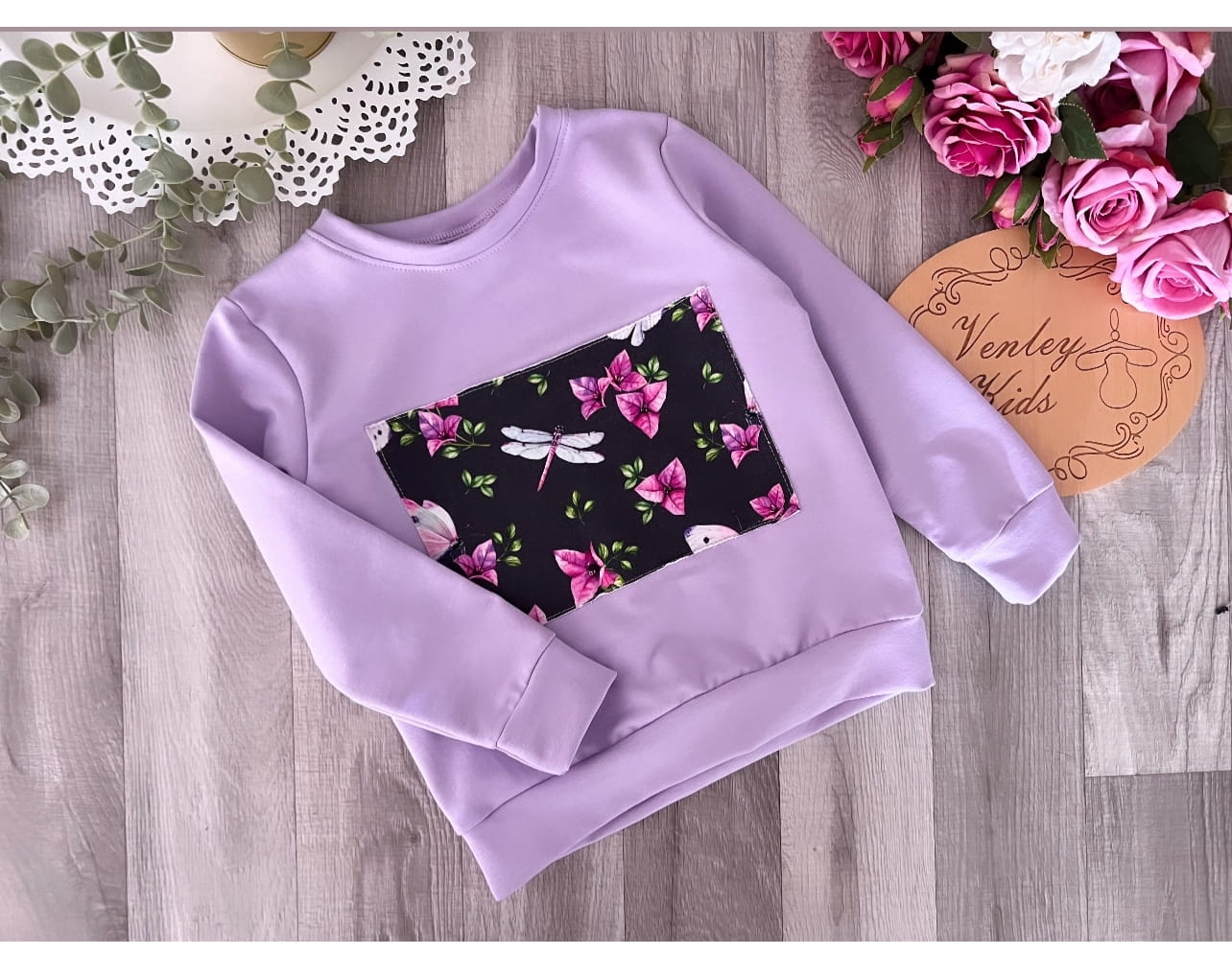 Bluza lila z ważkami w kwiatach
