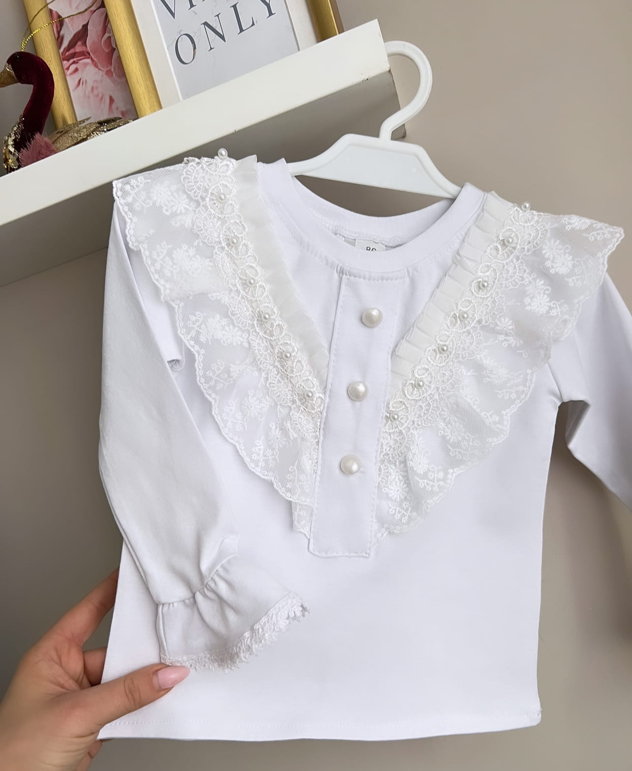 Bluzeczka z kilkoma warstwami koronki, pliski i perełek. Rękawek rozkloszowany z koronką