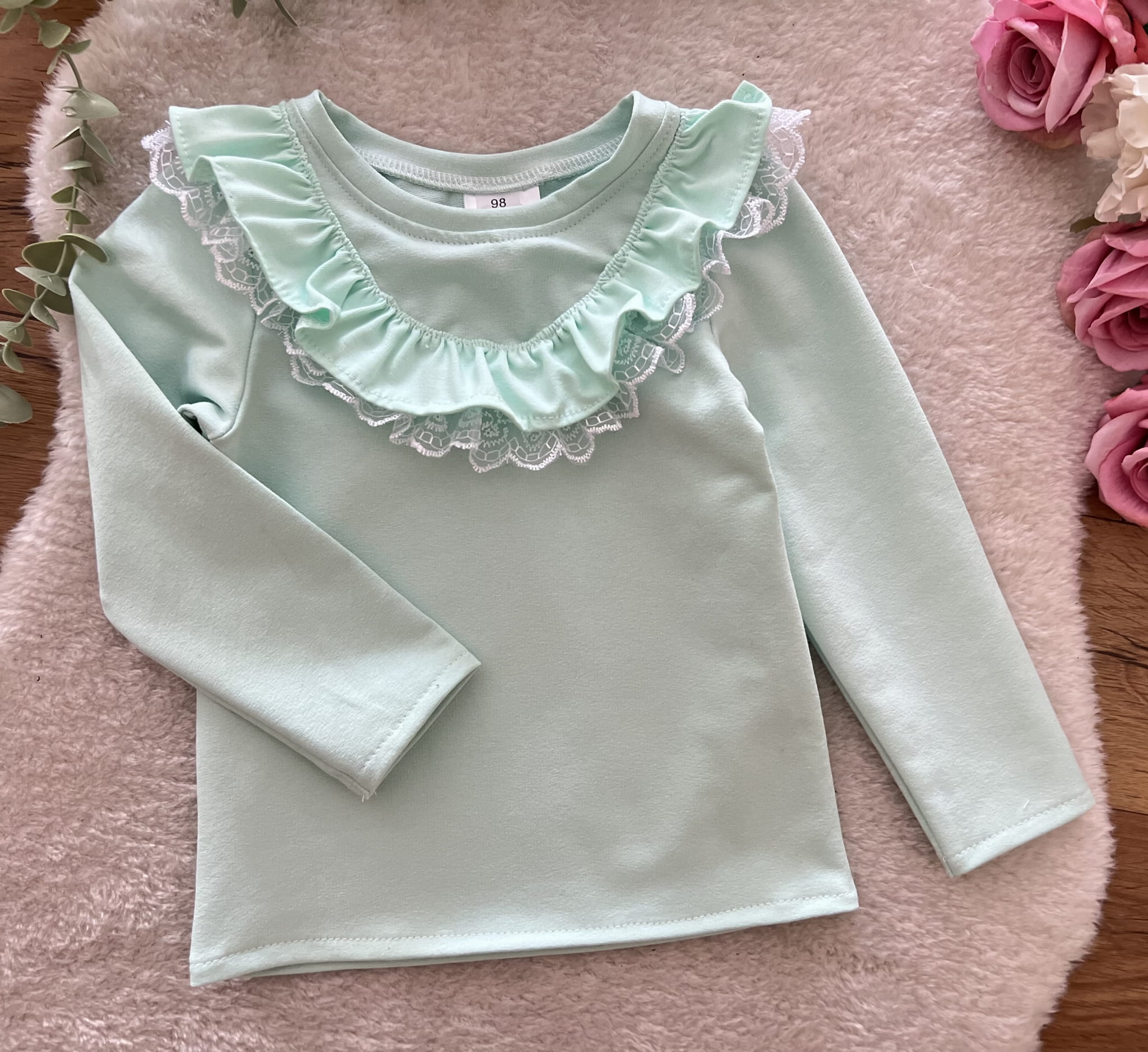 Body lub bluzka z falbanką w kształcie U, od spodu koronka haft na tiulu efekt 3 d