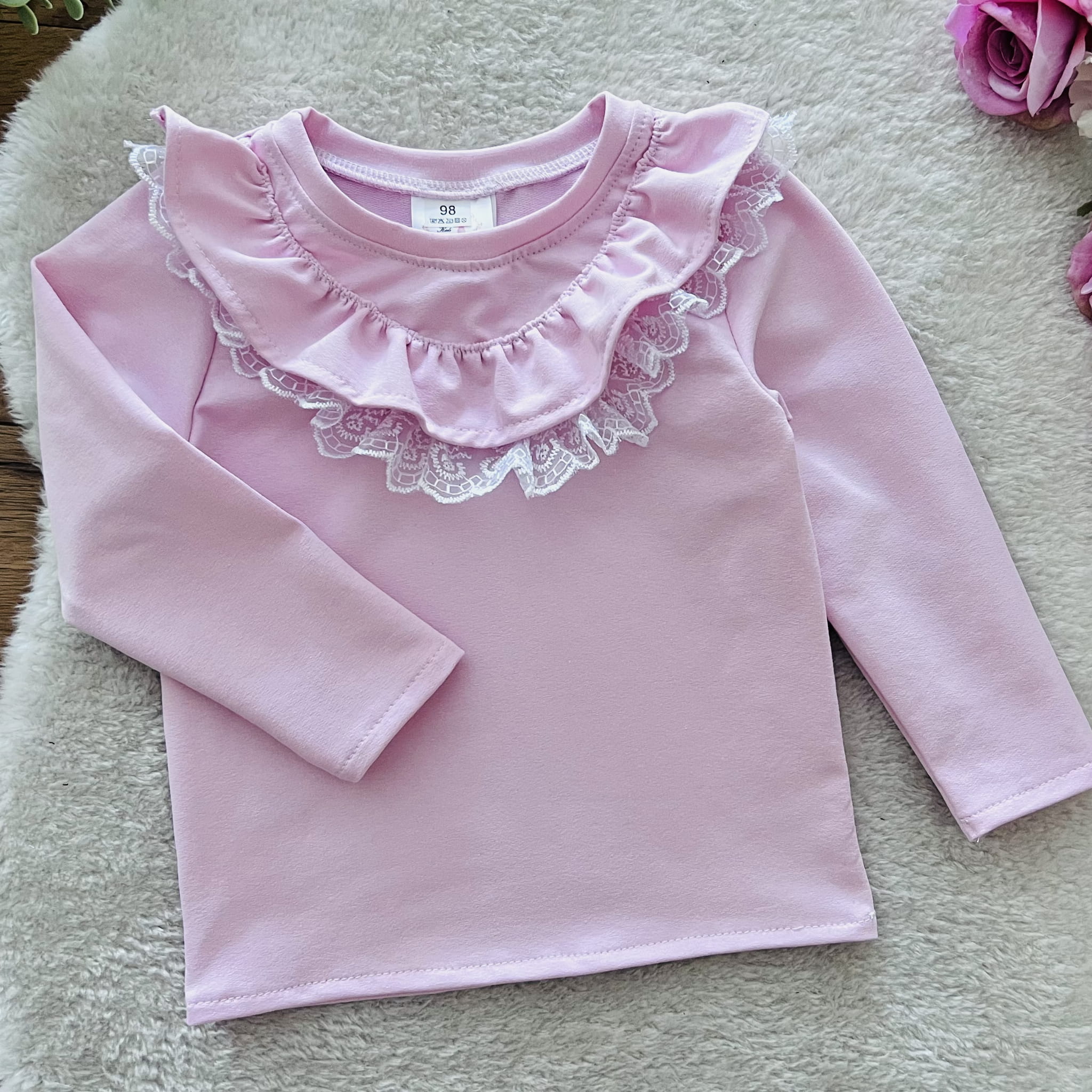 Body lub bluzka z falbanką w kształcie U, od spodu koronka haft na tiulu efekt 3 d