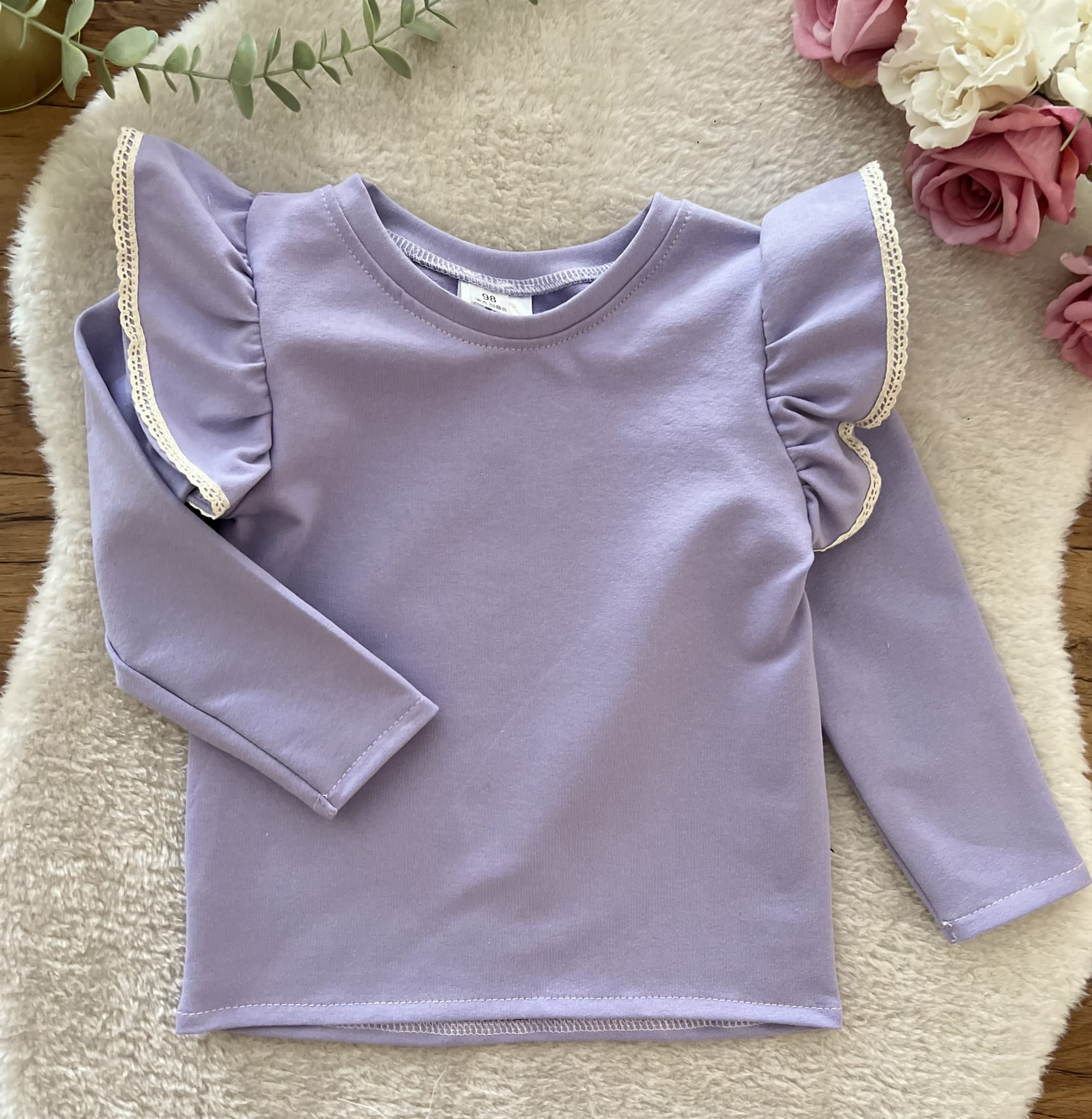 Body lub bluzka z falbanką na ramionach, falbanka ozdabiana koronką