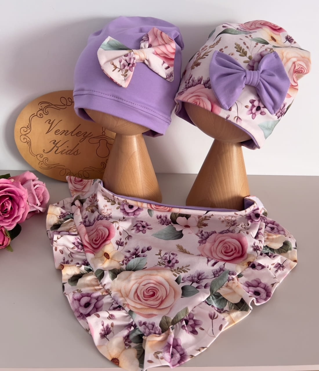 Czapka turban chusta lila + kolorowy kwiat