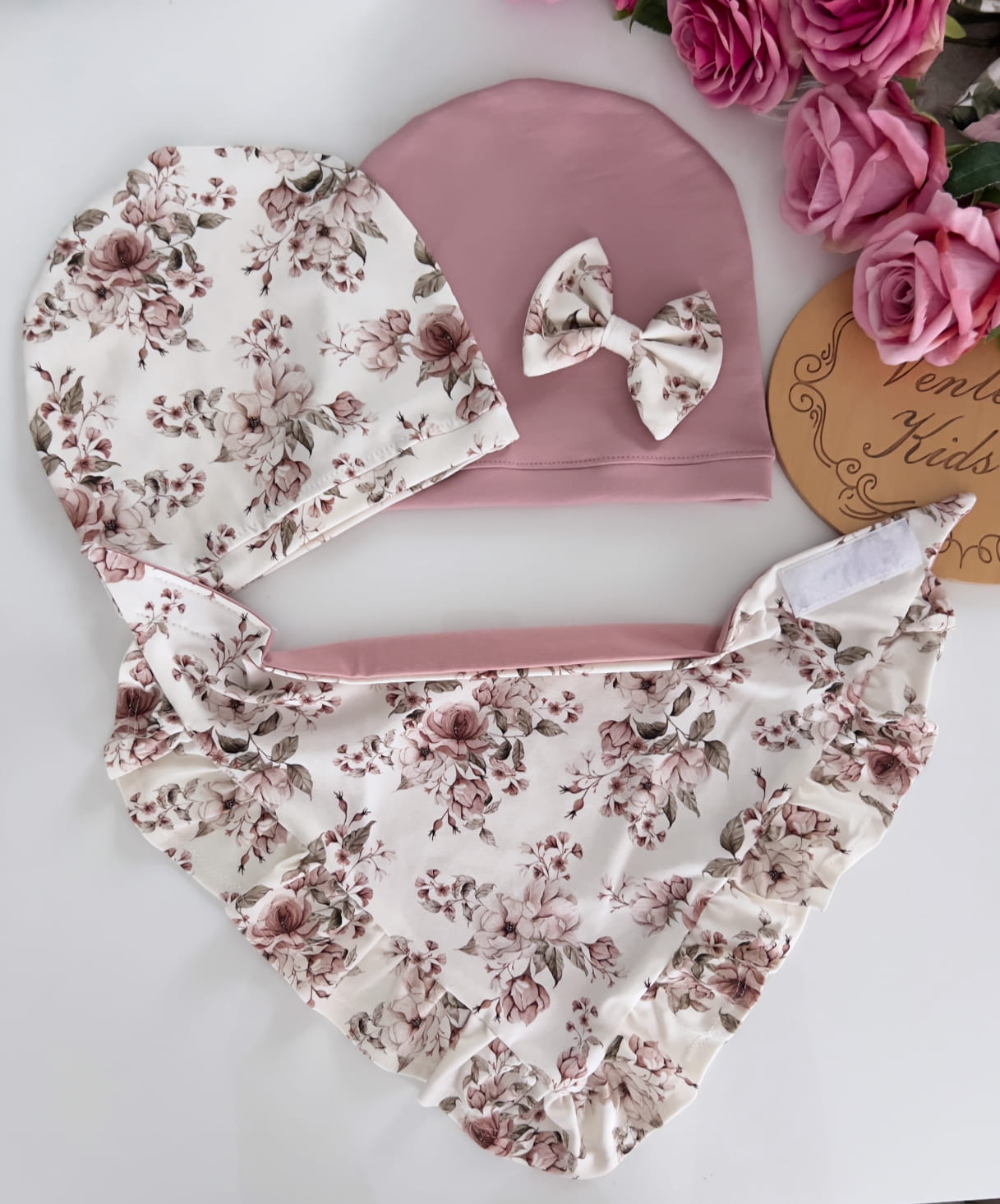 - Czapka z kokardką i chusta z falbanką