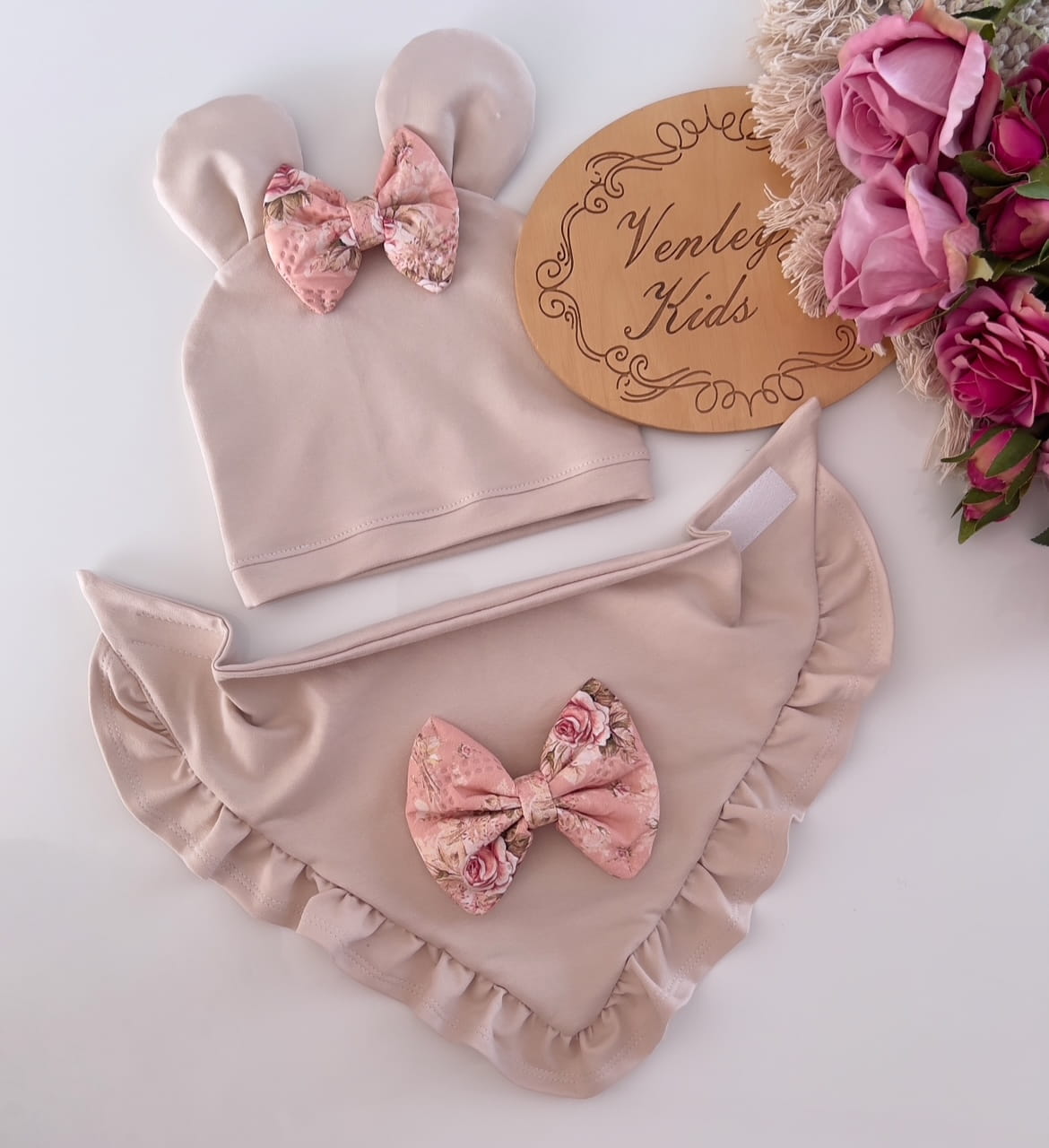 Czapka z chustką beż z róże na pudrze