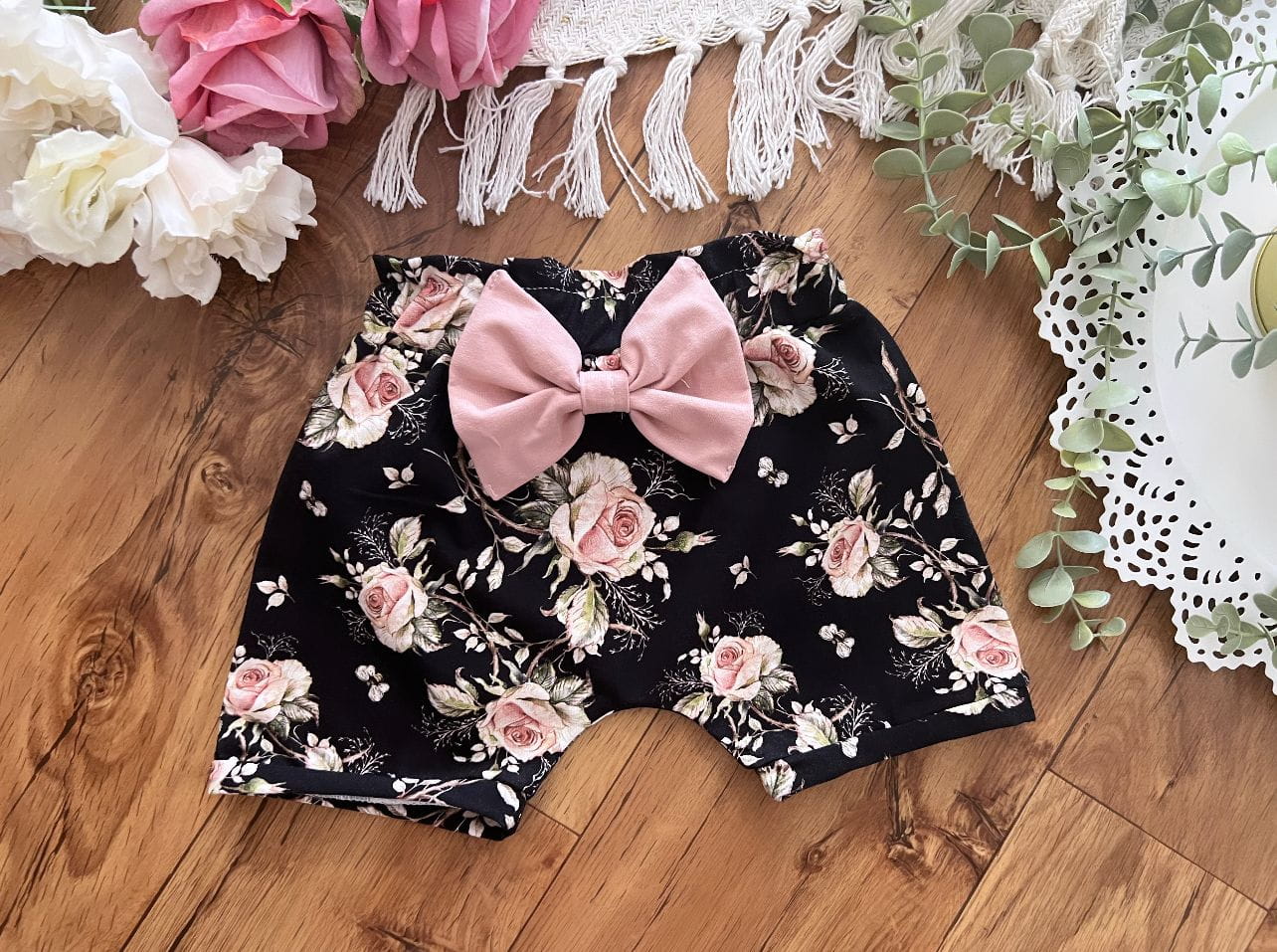 Krótkie spodenki z kokardką wyższy stan róże na ciemnym