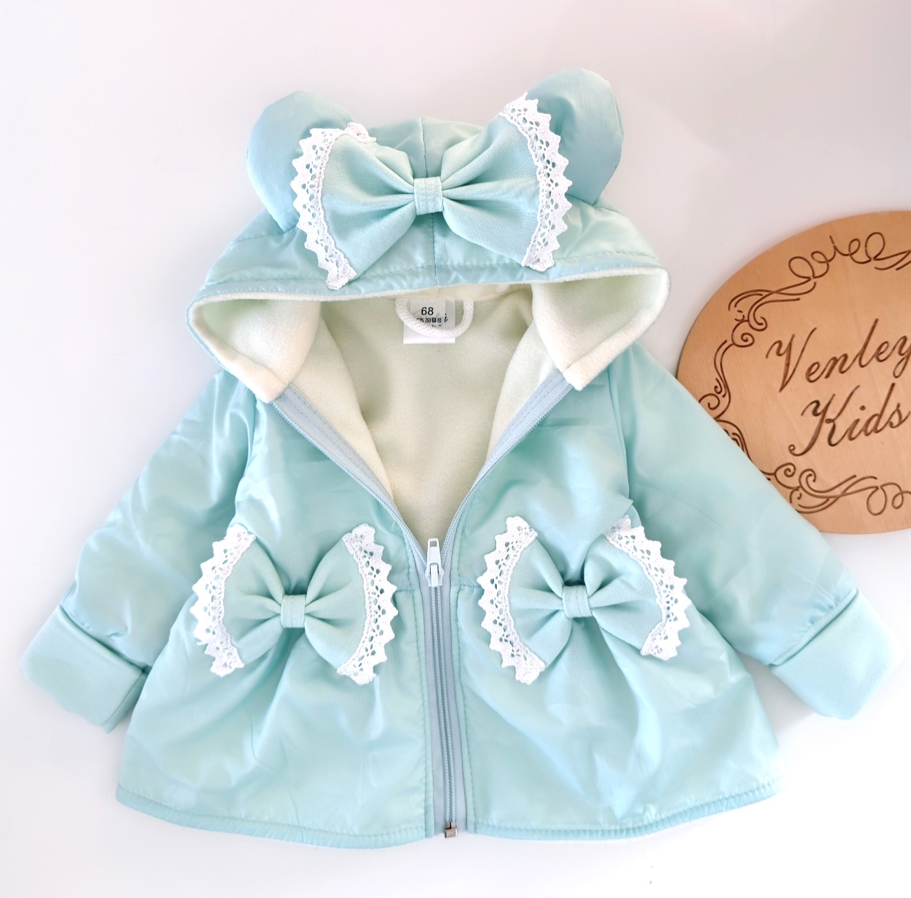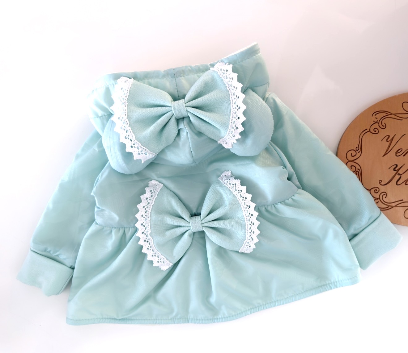 Płaszczyk baskinka - ozdabiany kokardkami, które dodatkowo obszyte są koronką