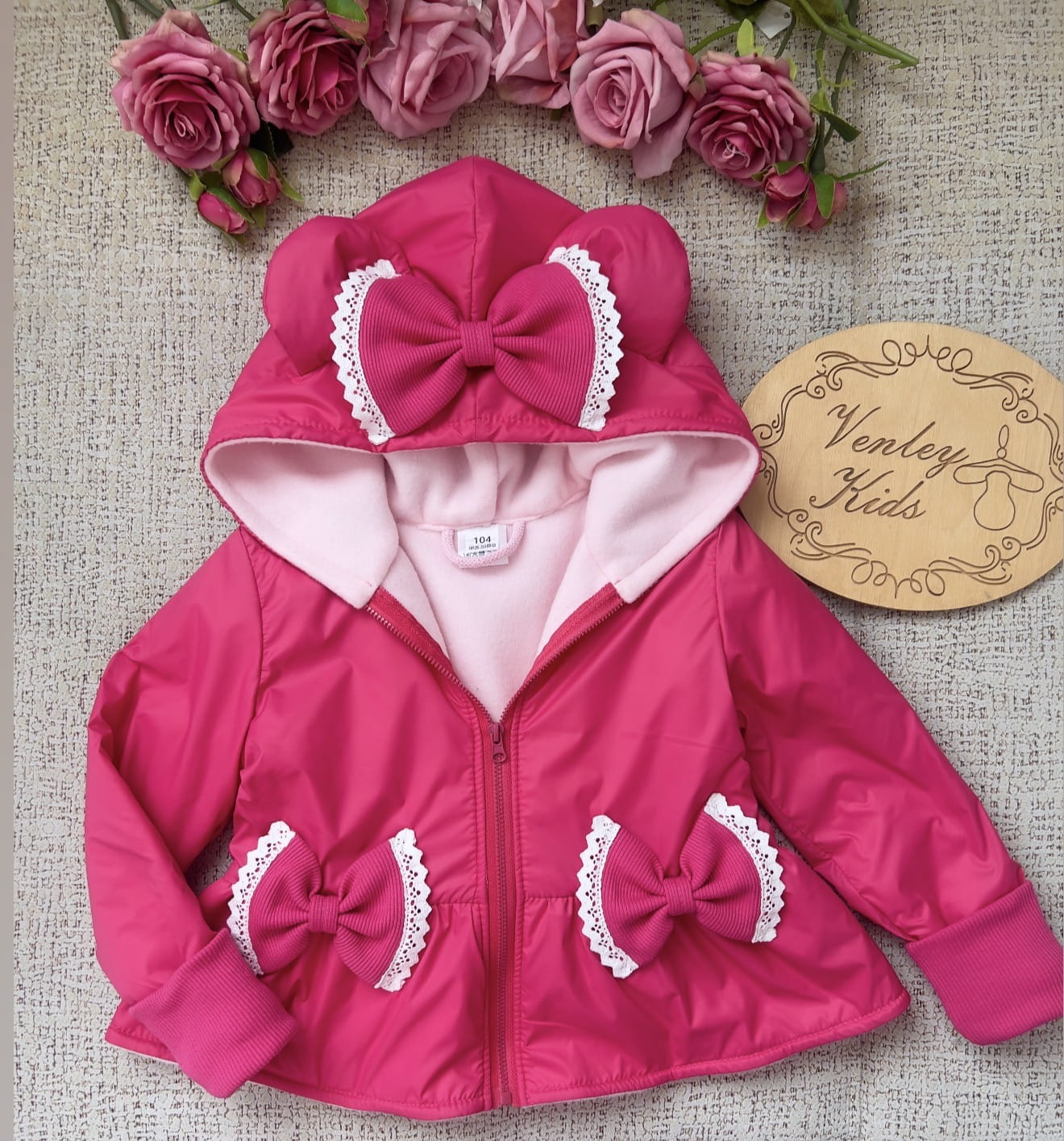 Płaszczyk baskinka - ozdabiany kokardkami, które dodatkowo obszyte są koronką