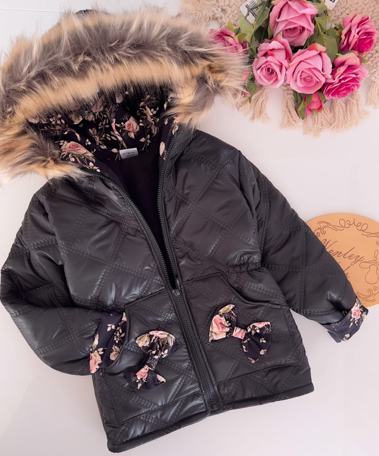 Kurtka zimowa czarna z róże na ciemnym