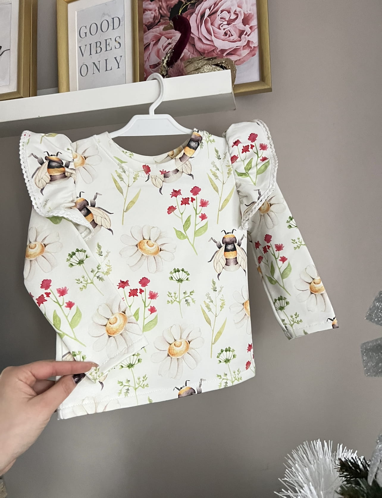 Bluzeczka z falbankami na ramionach ozdabiana koronką