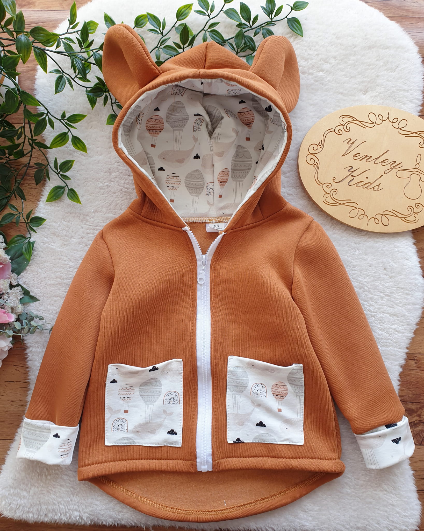 Płaszczyk przedłużany, z kapturem i uszkami. Kieszonki oraz wewnątrz