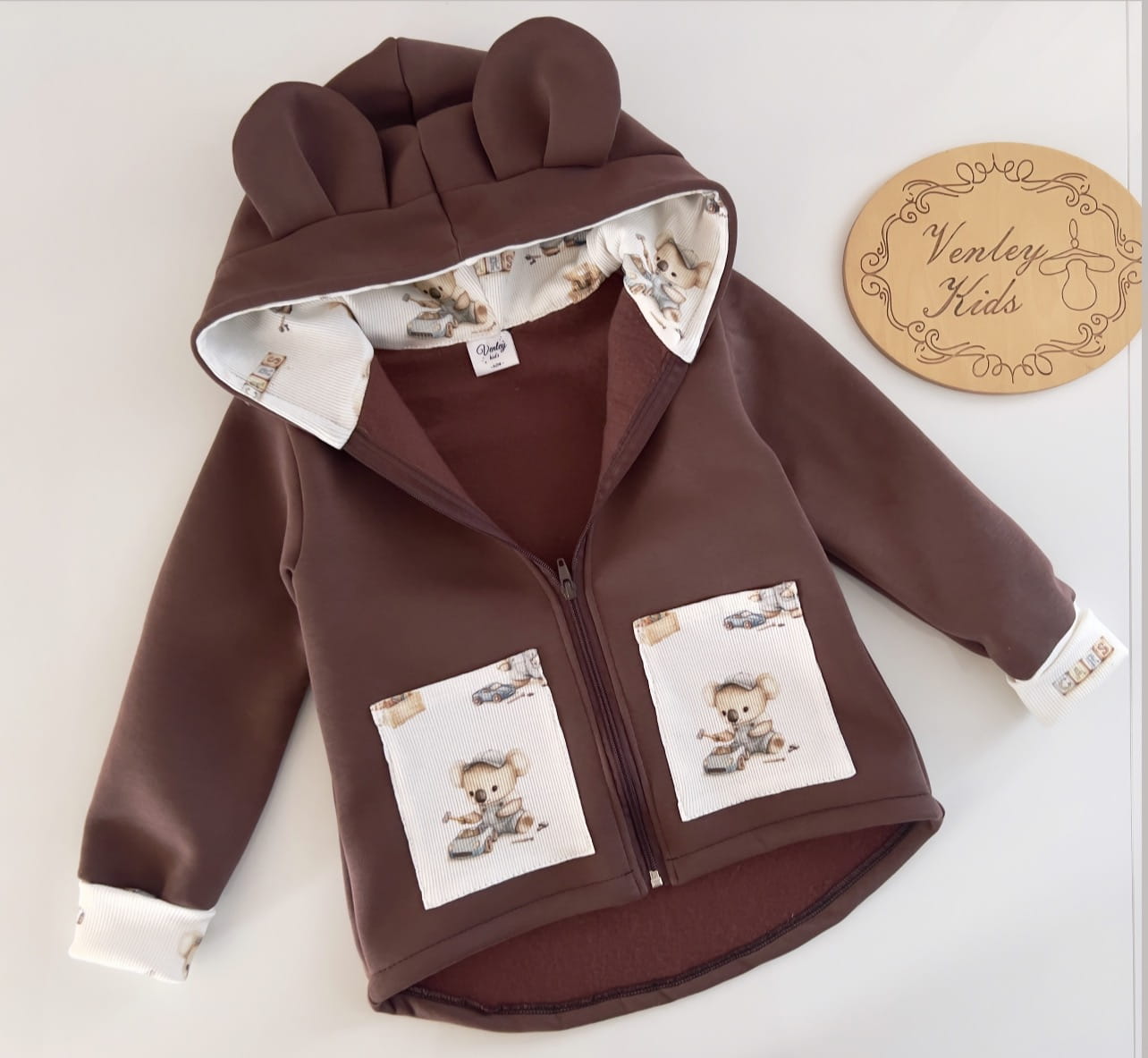 Płaszczyk przedłużany, z kapturem i uszkami. Kieszonki oraz wewnątrz kaptura ozdabiany wzorem