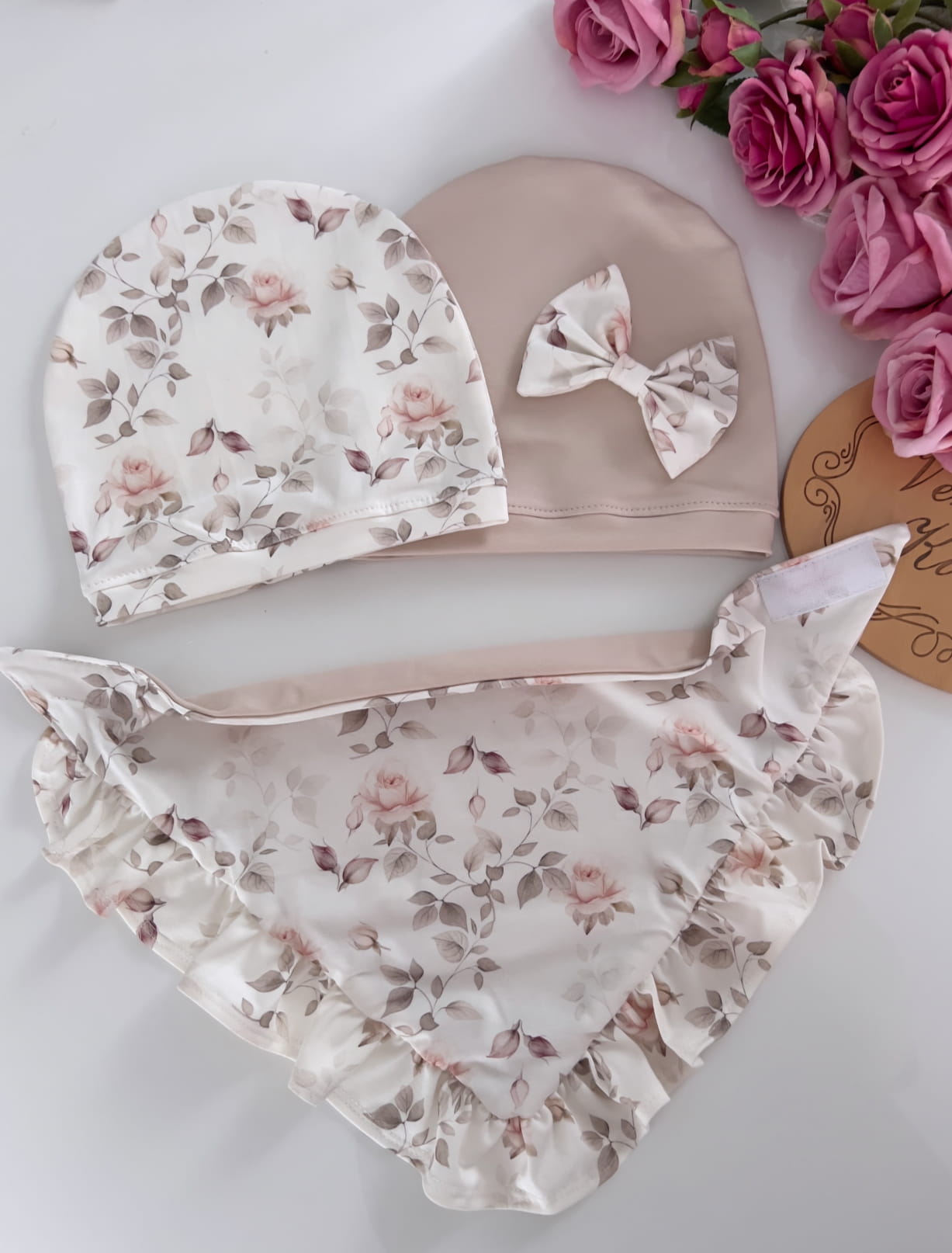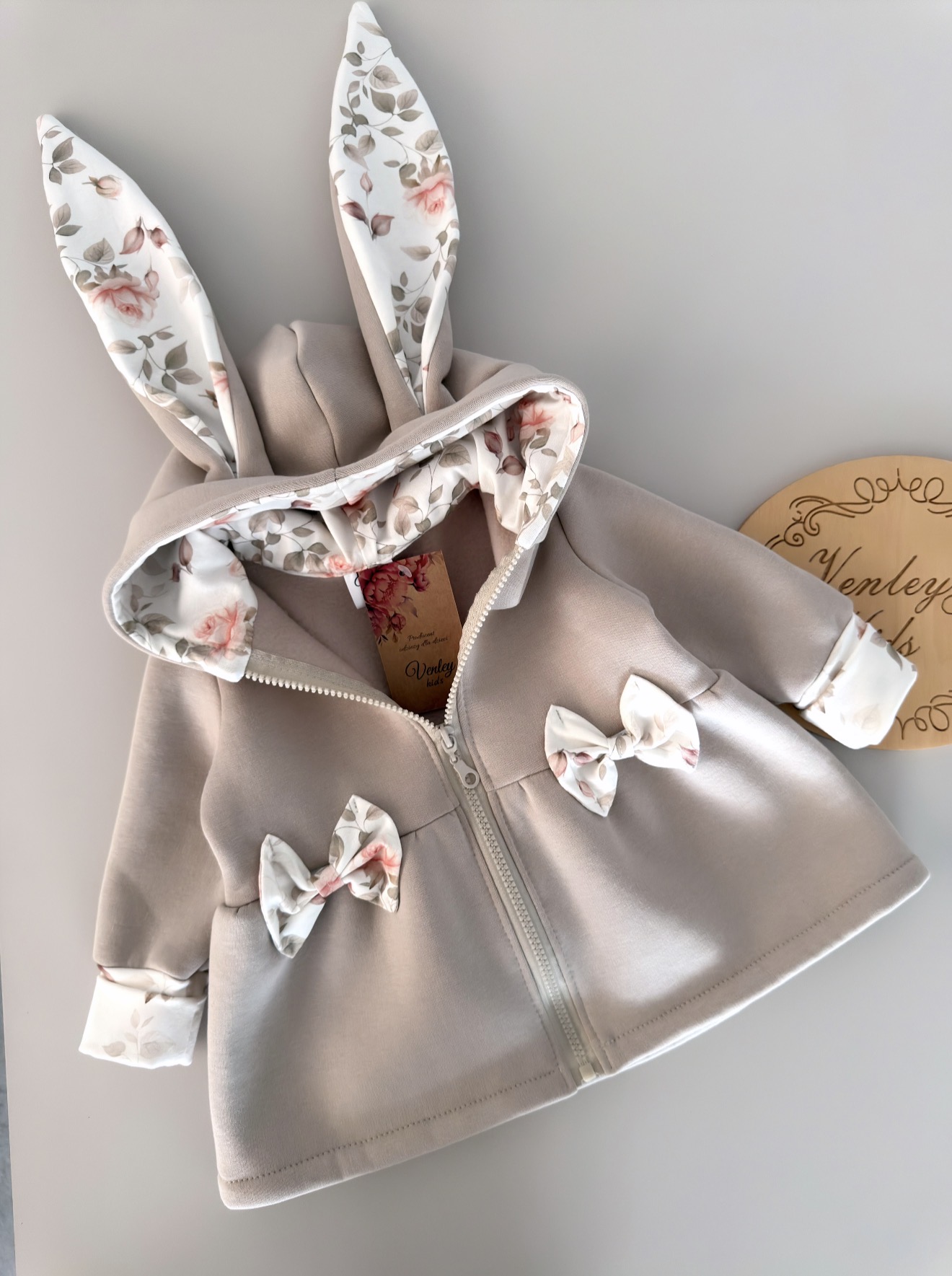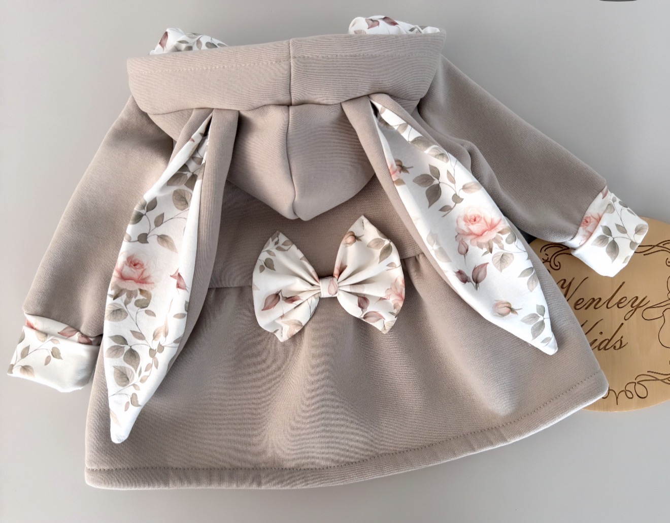 Płaszczyk przedłużany - rozkloszowany , z kapturem i uszkami królika . Kokardki oraz wewnątrz kaptura ozdabiany wzorem