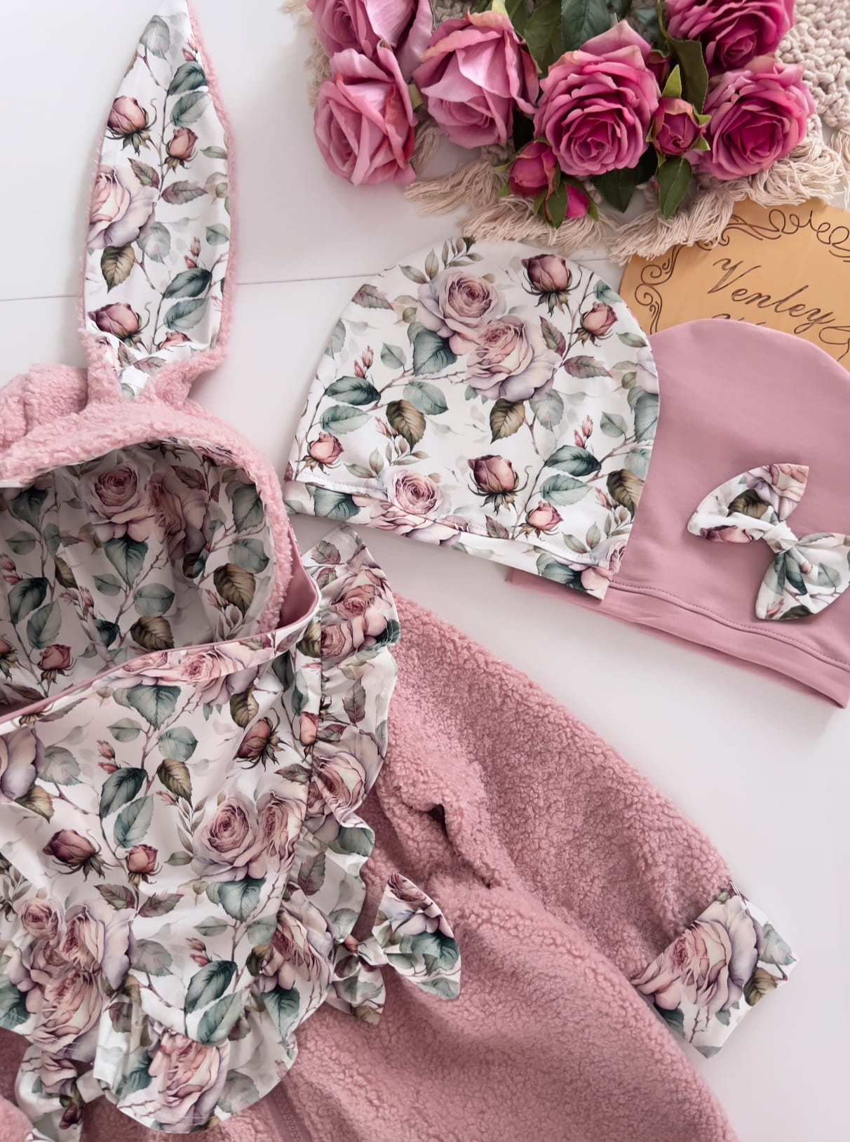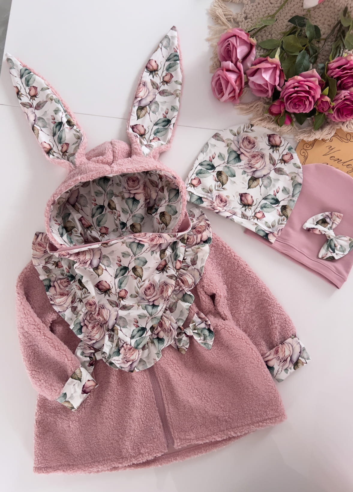 Płaszczyk przedłużany - rozkloszowany , z kapturem i uszkami królika . Kokardki oraz wewnątrz kaptura ozdabiany wzorem