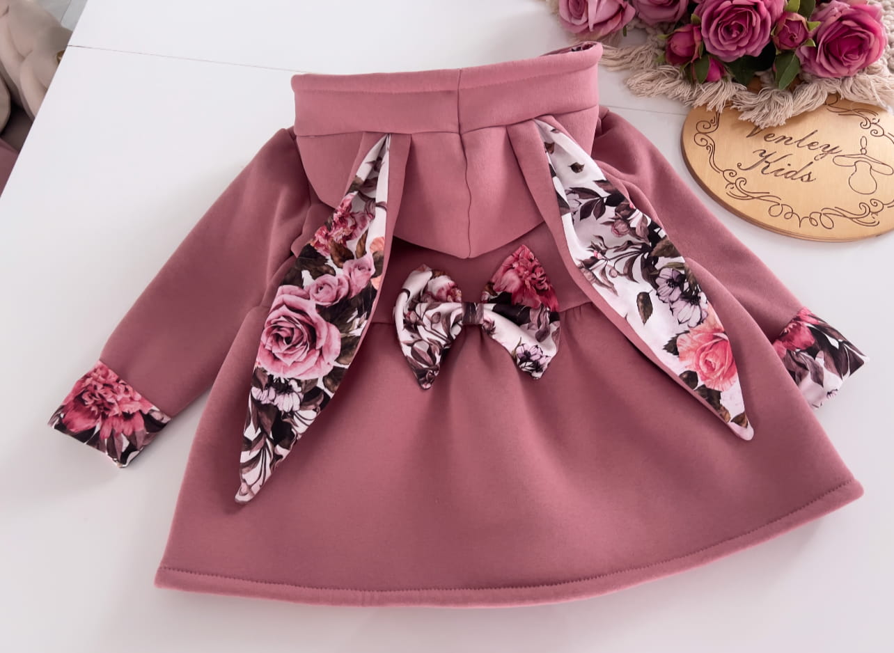Płaszczyk przedłużany - rozkloszowany , z kapturem i uszkami królika . Kokardki oraz wewnątrz kaptura ozdabiany wzorem