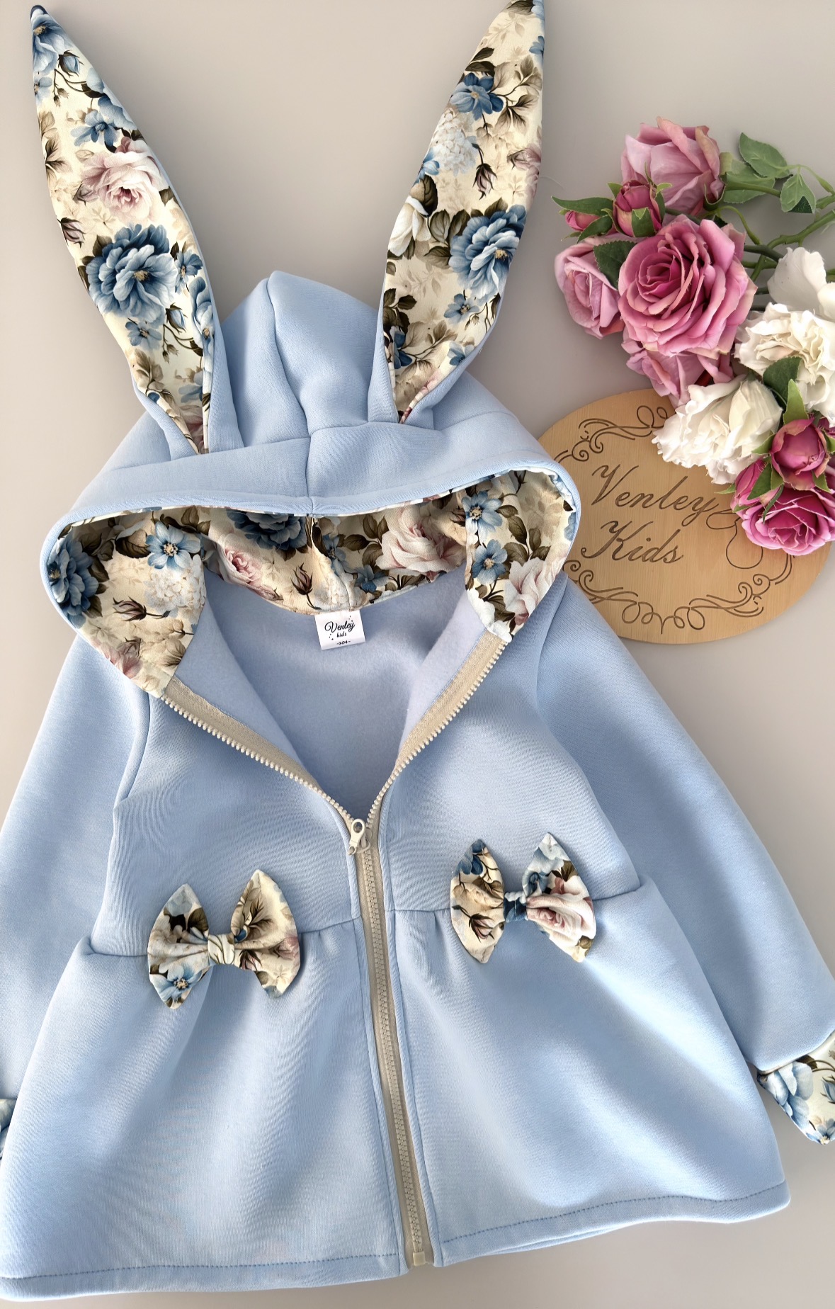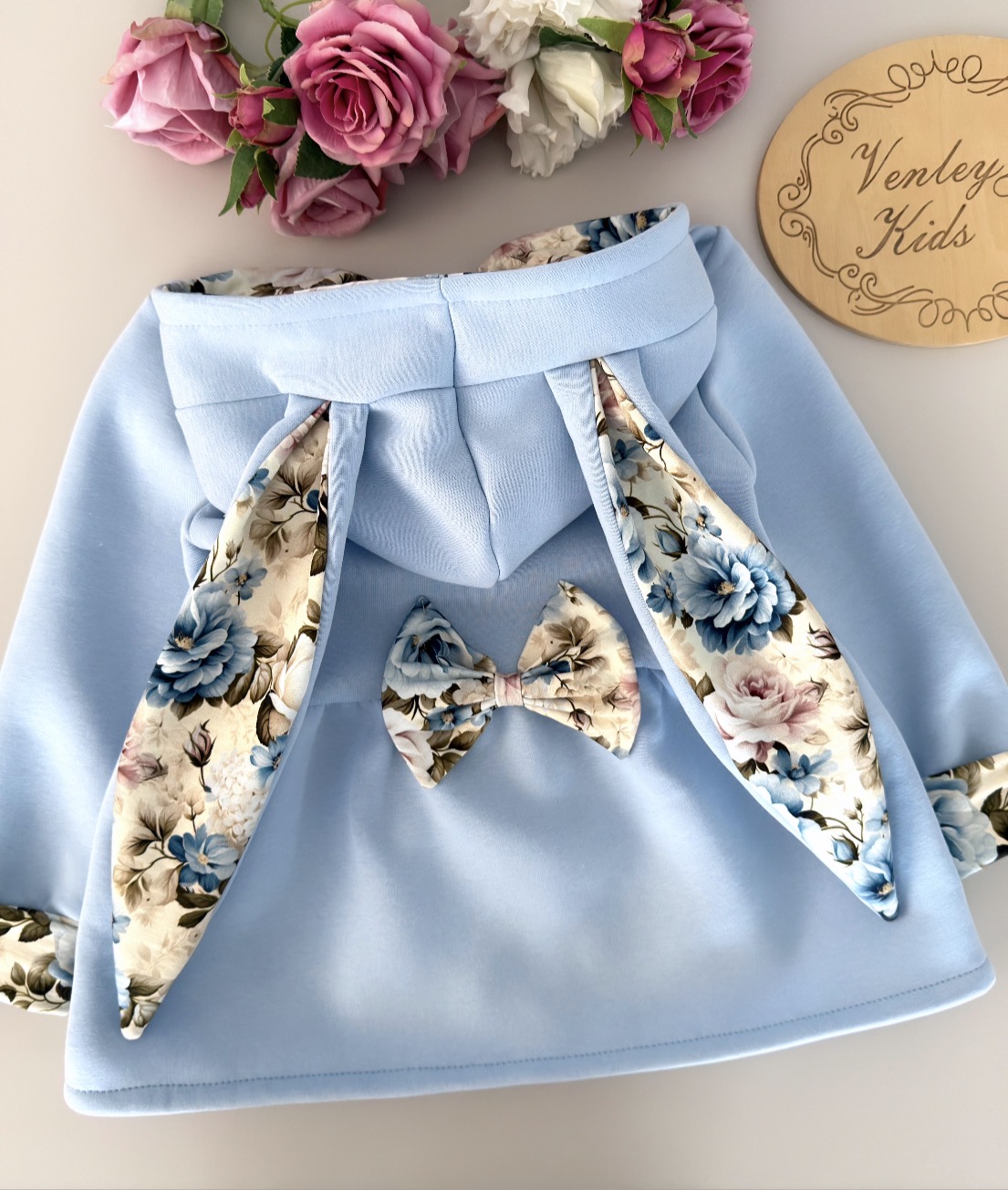 Płaszczyk przedłużany - rozkloszowany , z kapturem i uszkami królika . Kokardki oraz wewnątrz kaptura ozdabiany wzorem