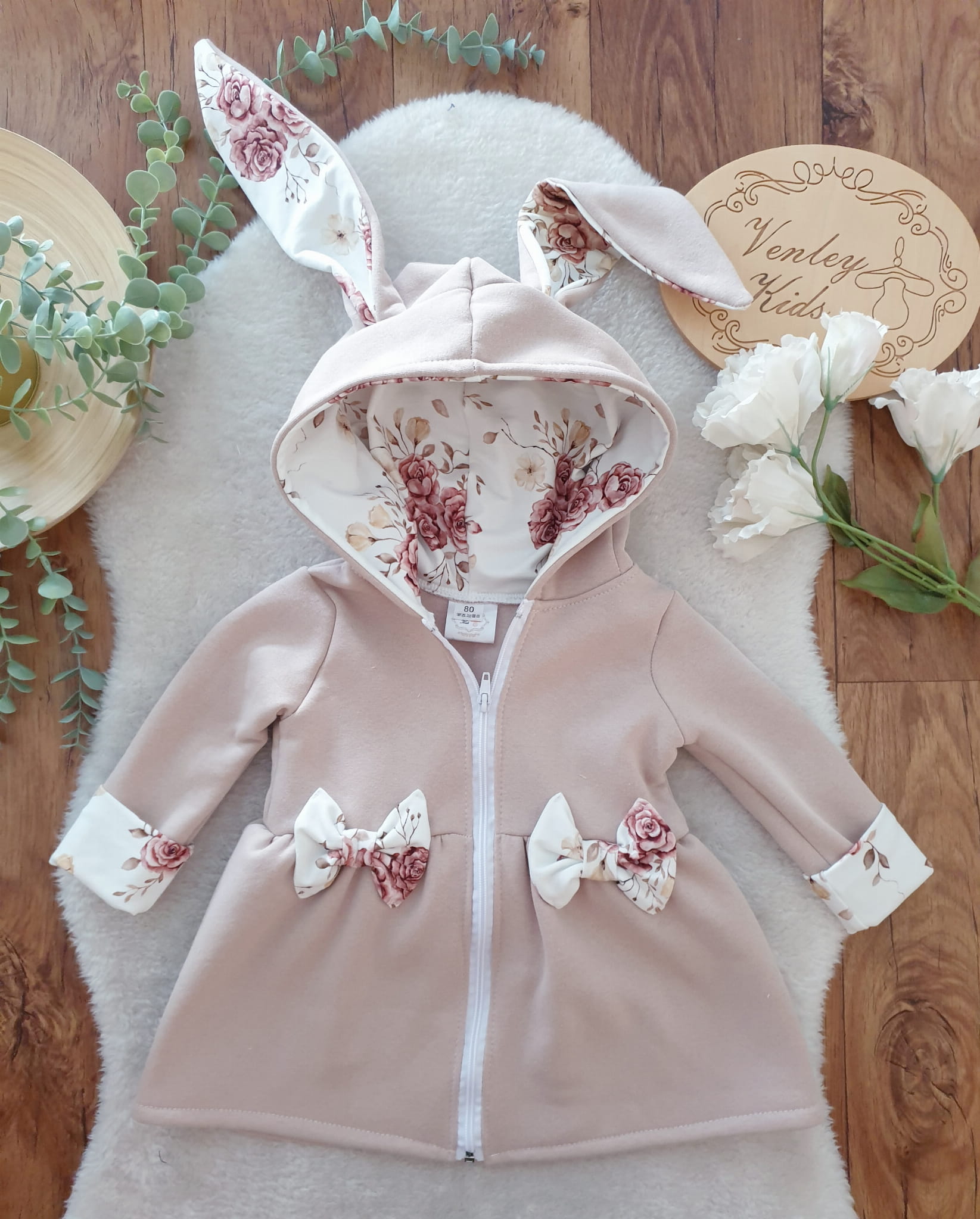Płaszczyk przedłużany - rozkloszowany , z kapturem i uszkami królika . Kokardki oraz wewnątrz kaptura ozdabiany wzorem