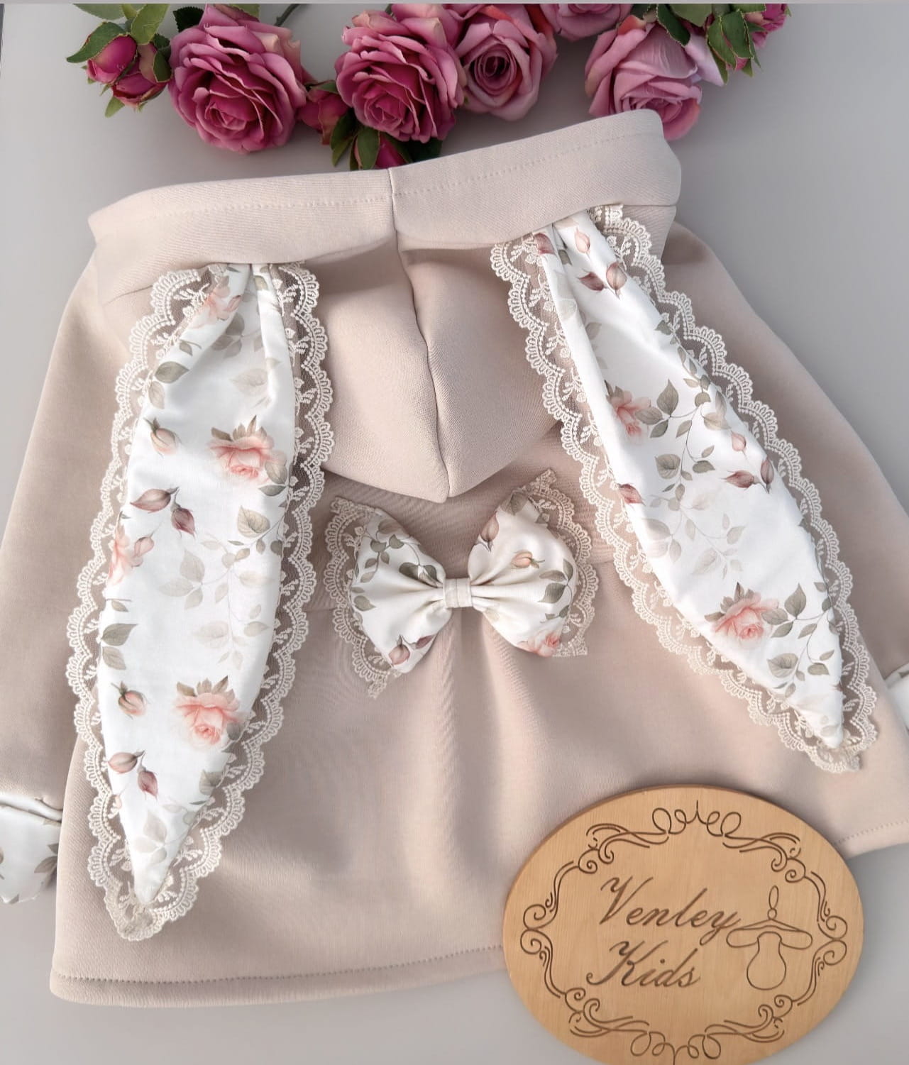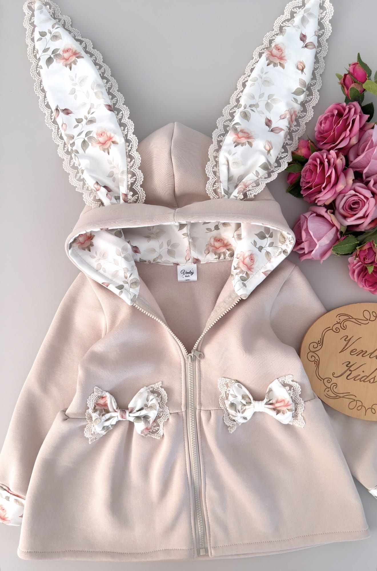 Płaszczyk przedłużany - rozkloszowany , z kapturem i uszkami królika . Kokardki oraz wewnątrz kaptura ozdabiany wzorem , dodatkowo ozdabiany koronką