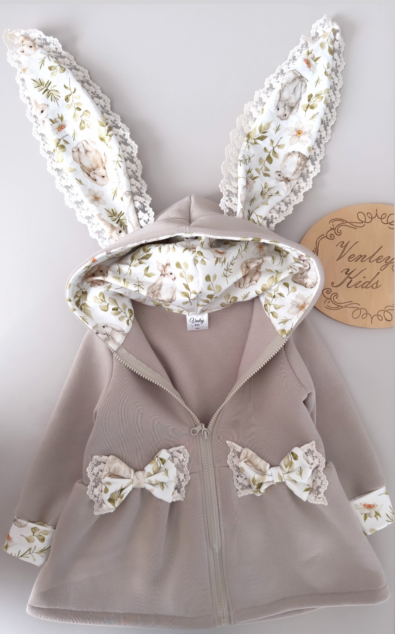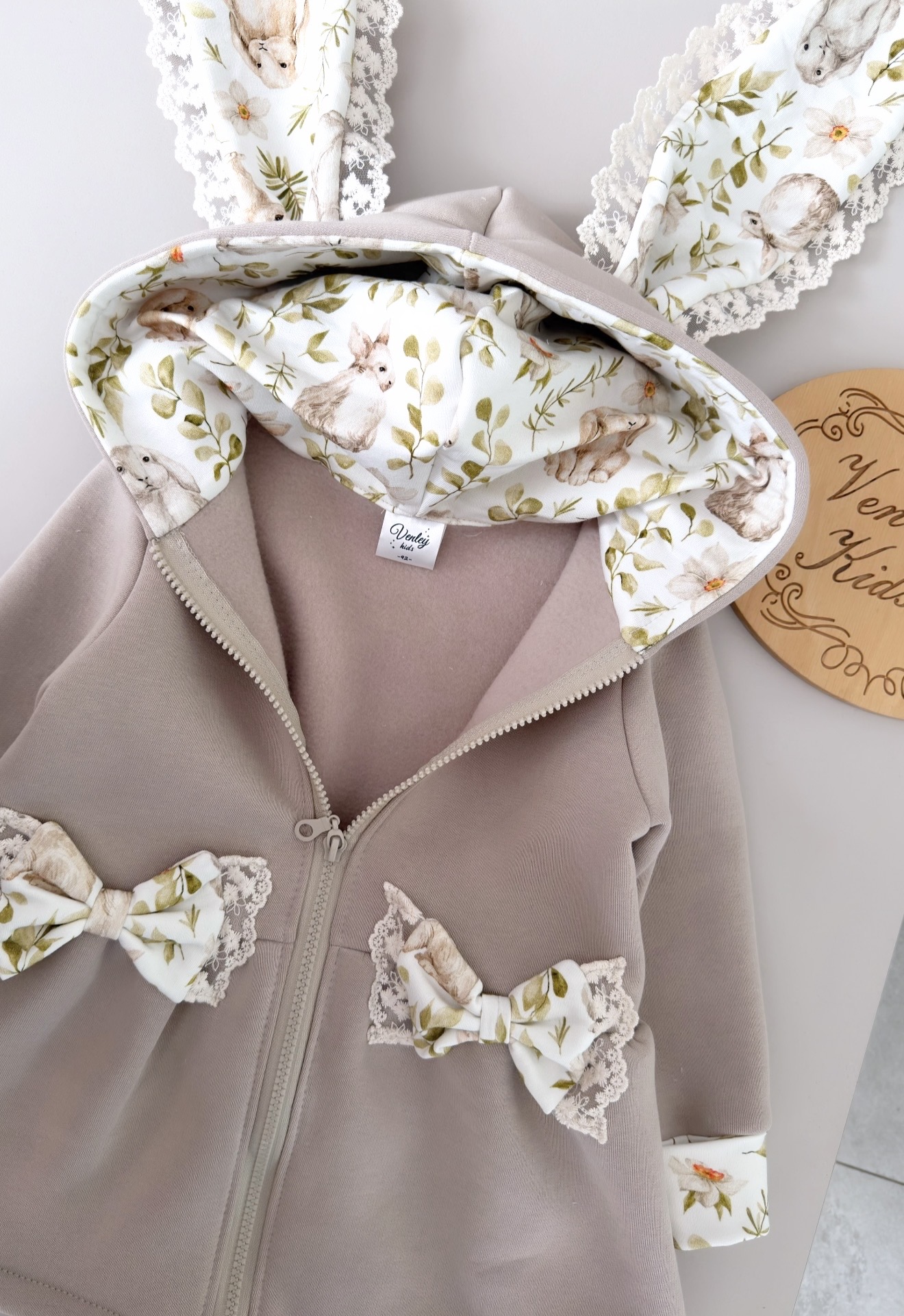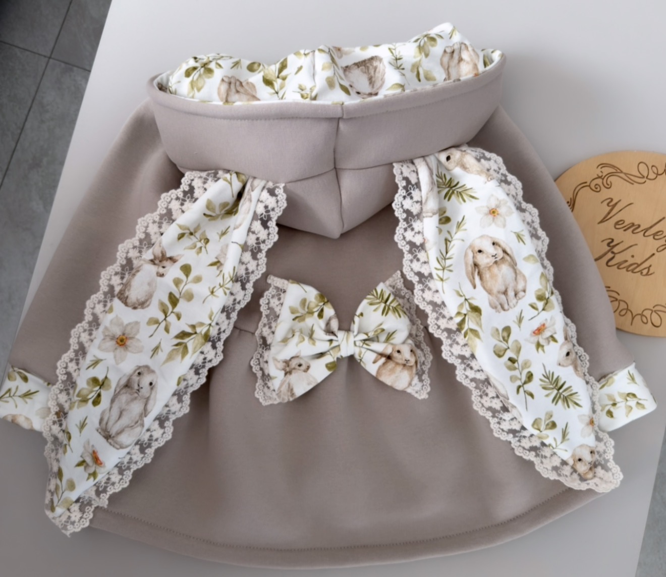 Płaszczyk przedłużany - rozkloszowany , z kapturem i uszkami królika . Kokardki oraz wewnątrz kaptura ozdabiany wzorem , dodatkowo ozdabiany koronką