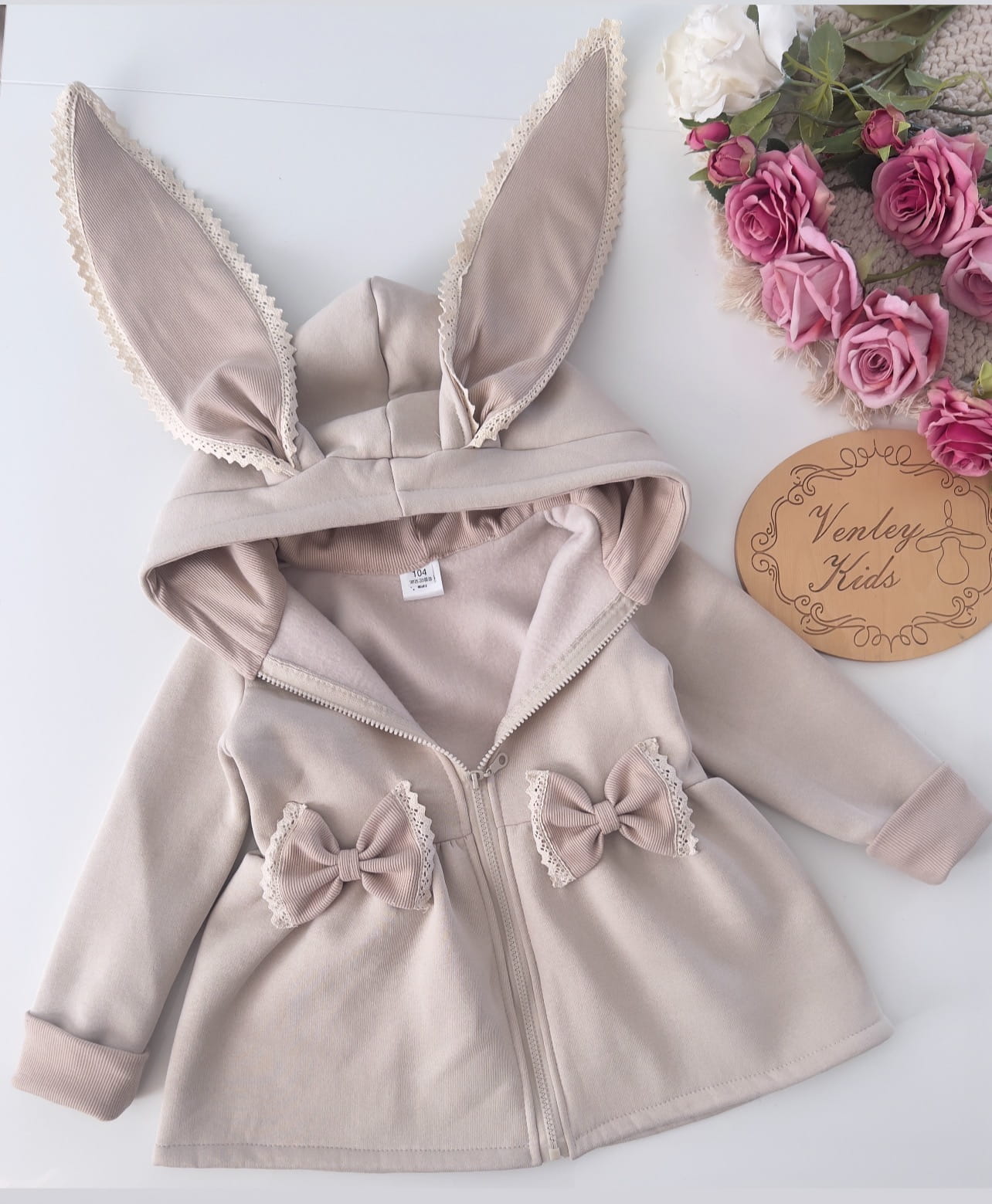 Płaszczyk przedłużany - rozkloszowany , z kapturem i uszkami królika . Kokardki oraz wewnątrz kaptura ozdabiany prążkiem