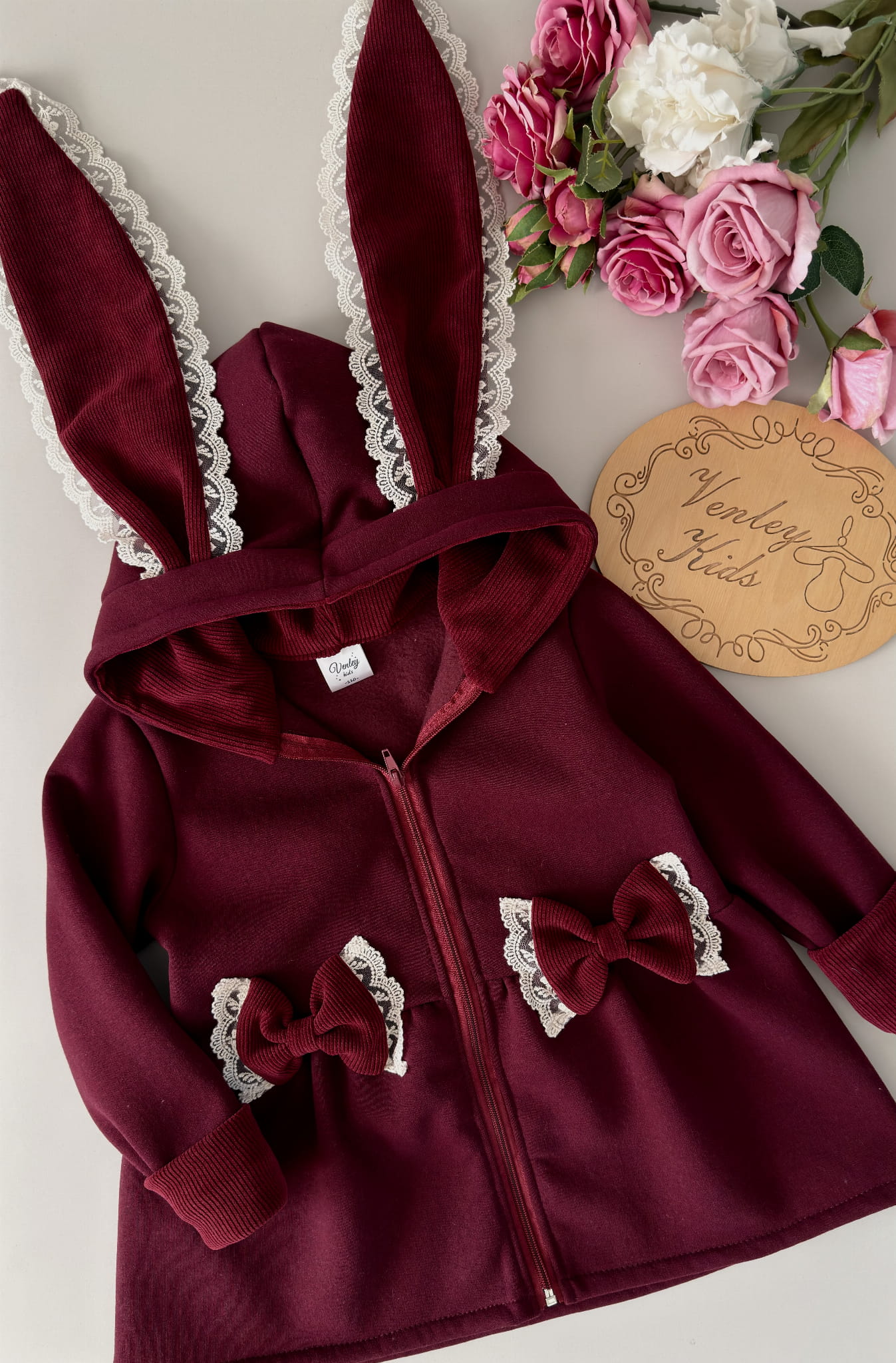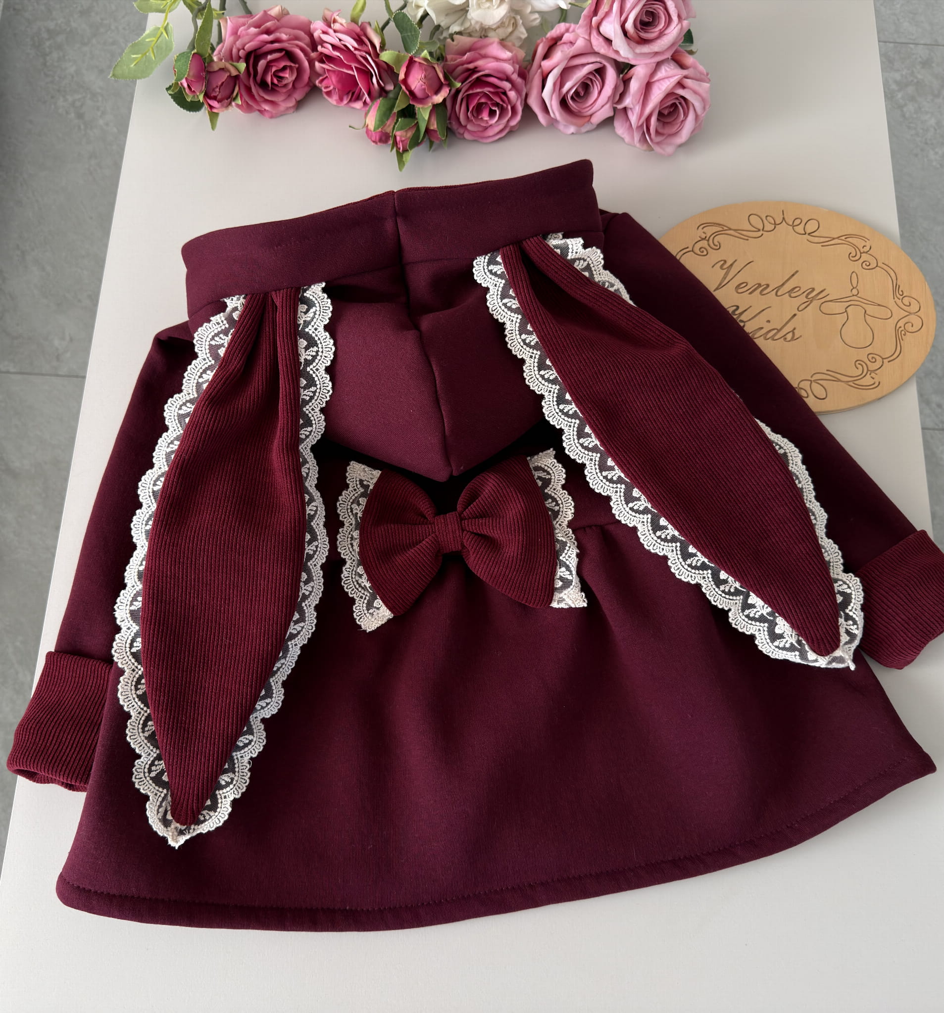Płaszczyk przedłużany - rozkloszowany , z kapturem i uszkami królika . Kokardki oraz wewnątrz kaptura ozdabiany prążkiem, dodatkowo ozdabiany koronką