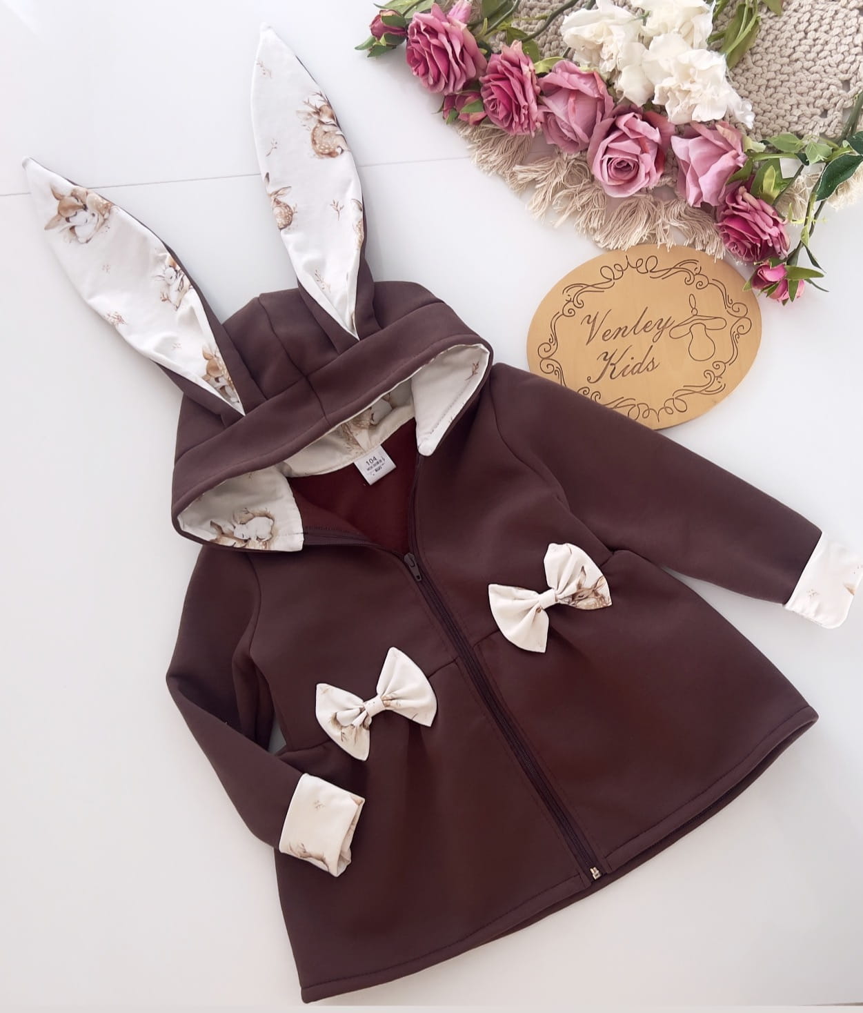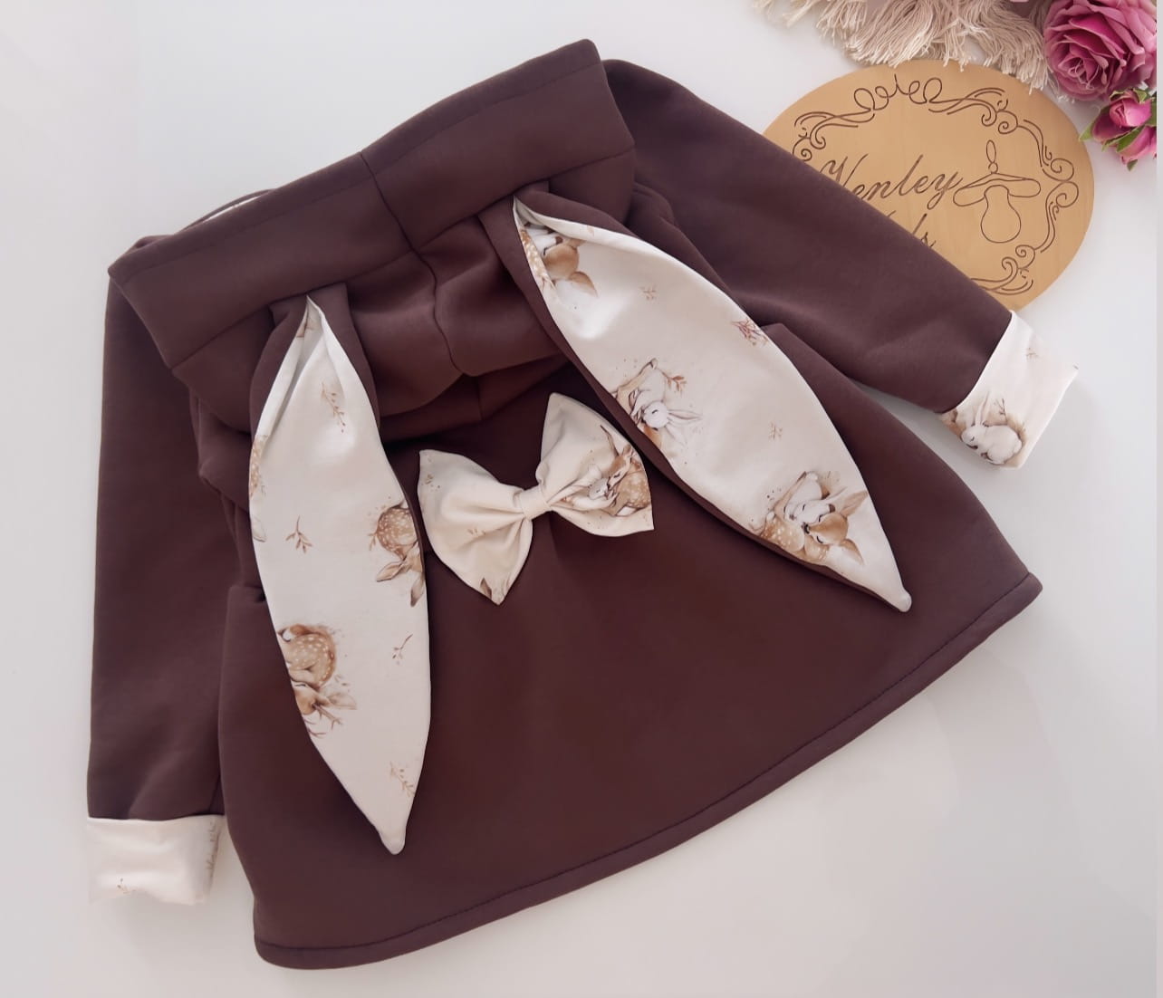 Płaszczyk przedłużany - rozkloszowany , z kapturem i uszkami królika