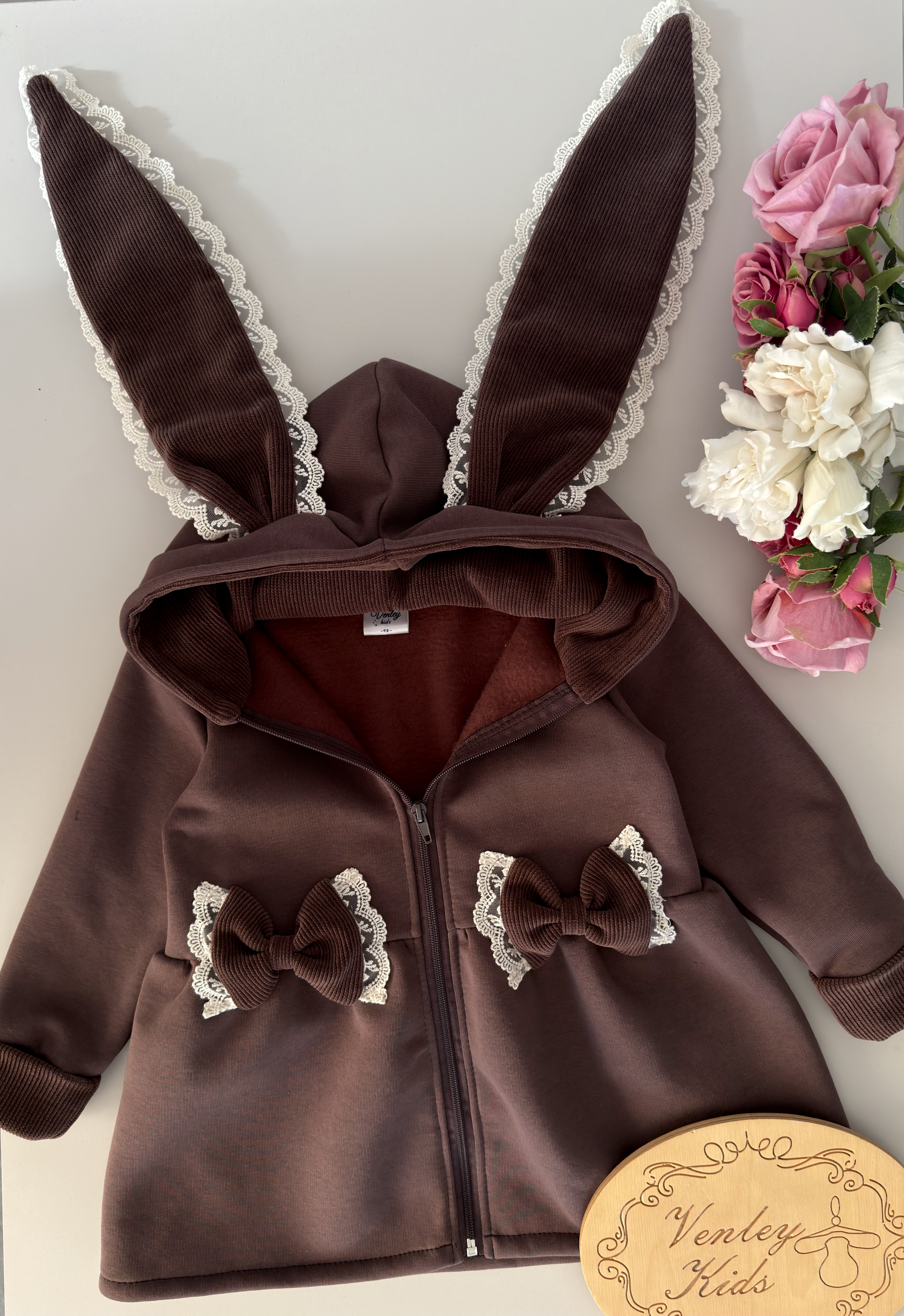 Płaszczyk przedłużany - rozkloszowany , z kapturem i uszkami królika . Kokardki oraz wewnątrz kaptura ozdabiany prążkiem, dodatkowo ozdabiany koronką