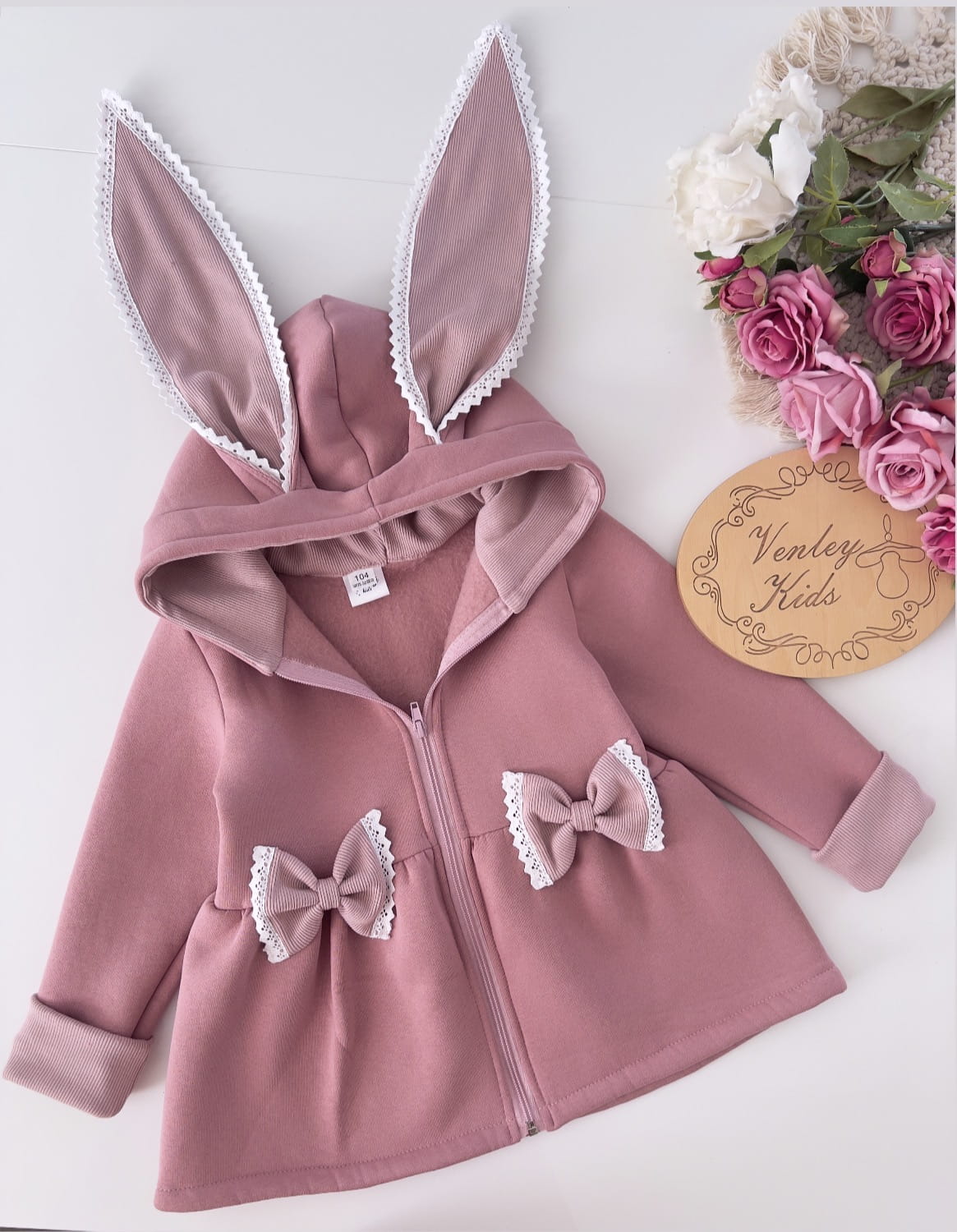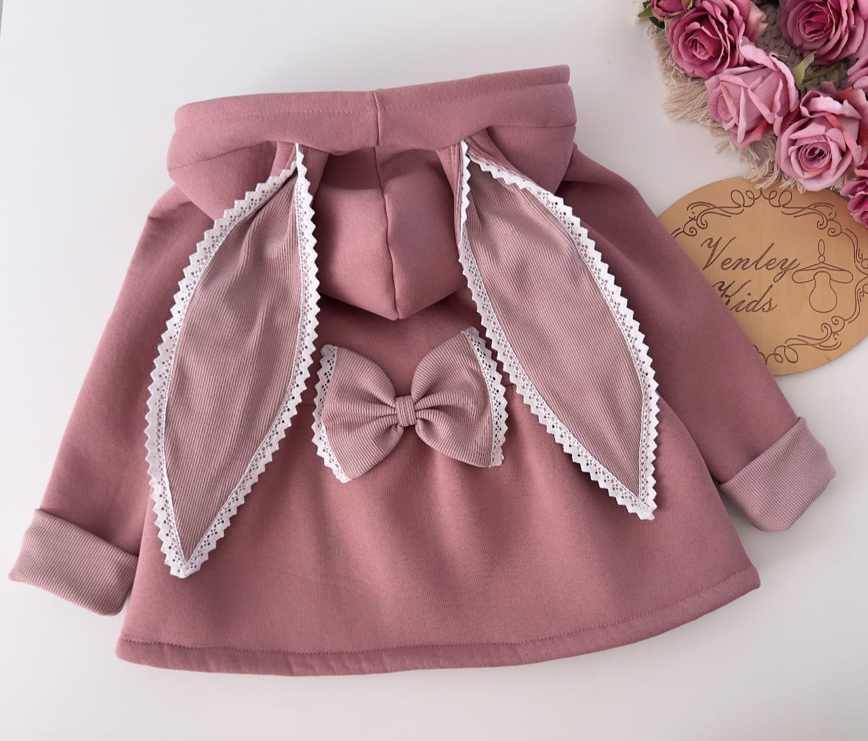 Płaszczyk przedłużany - rozkloszowany , z kapturem i uszkami królika . Kokardki oraz wewnątrz kaptura ozdabiany prązkiem