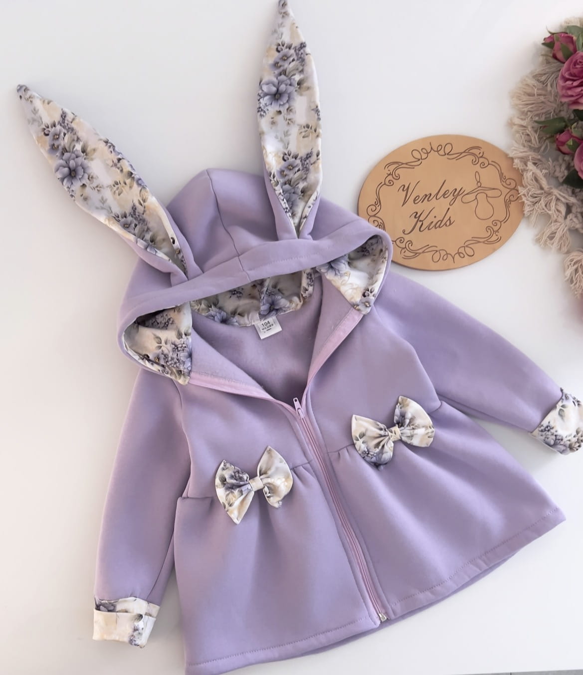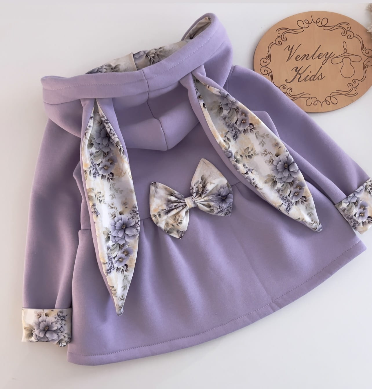 Płaszczyk przedłużany - rozkloszowany , z kapturem i uszkami królika