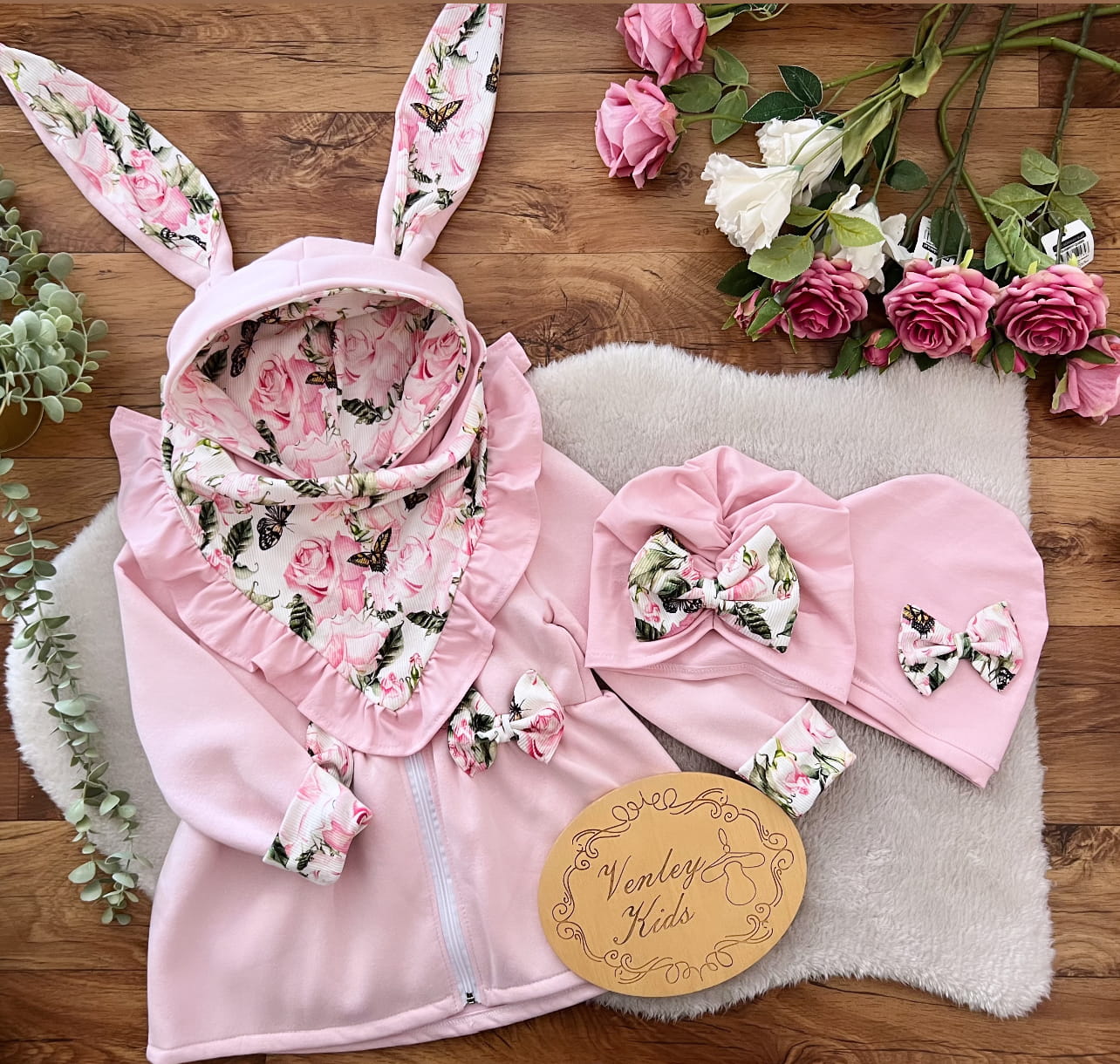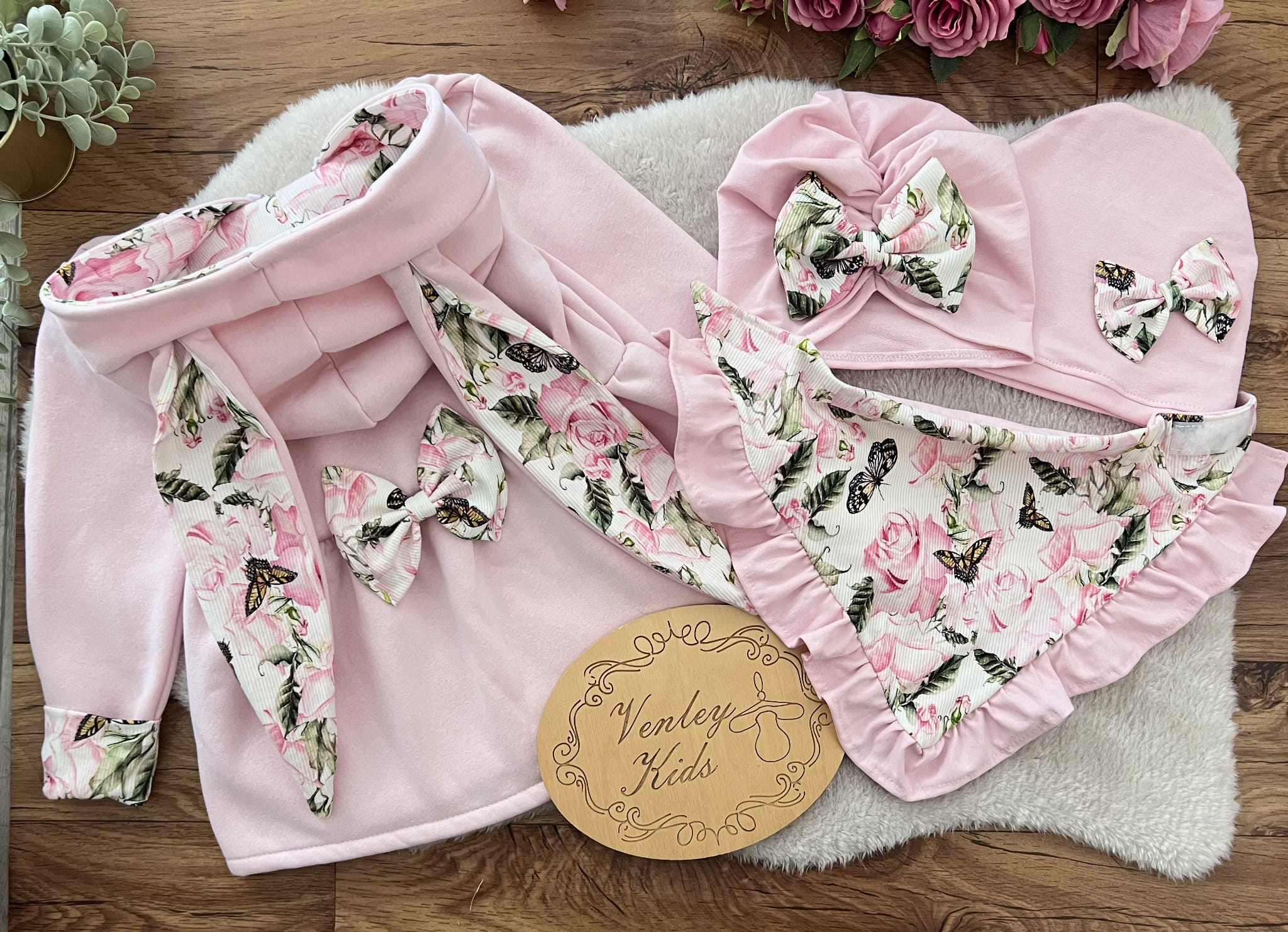 Płaszczyk Królik puder z prążkowanym materiałem kwiat z motylem