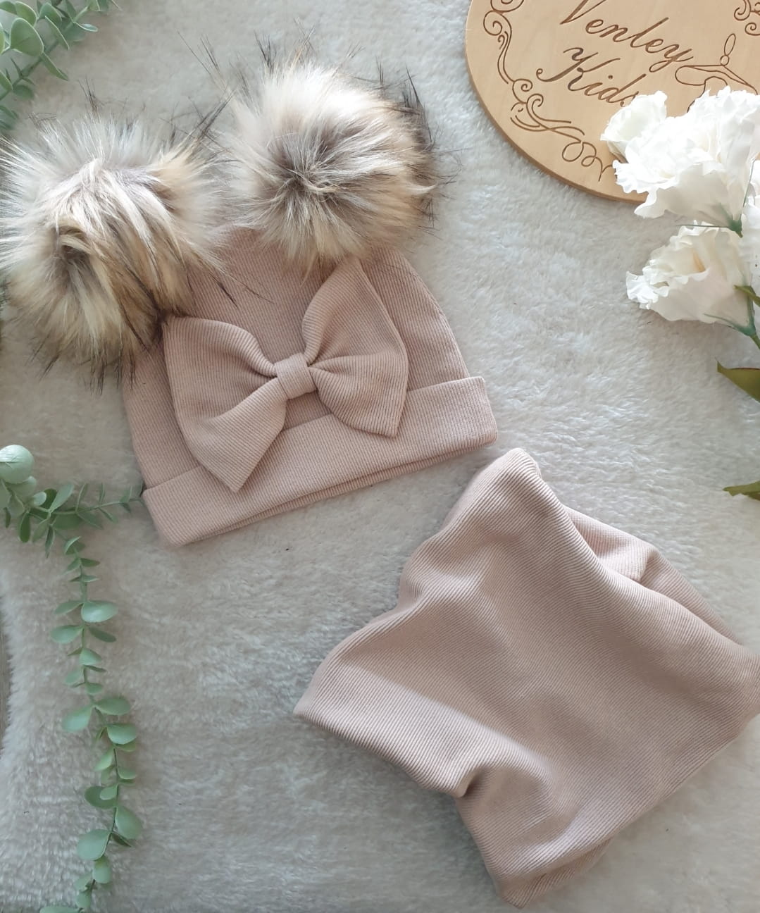 - Czapka prążkowana , duża kokarda oraz 2 pompony futrzane