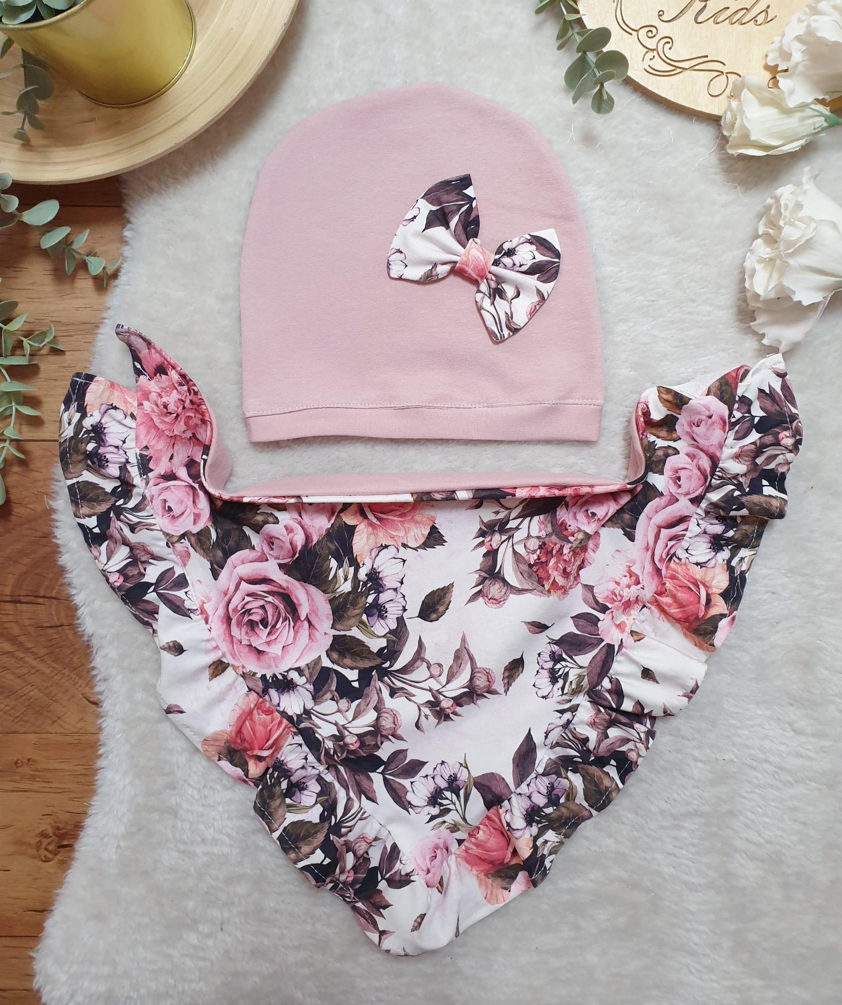RÓŻE NA BRUDNYM RÓŻU zestaw czapka z chustą
