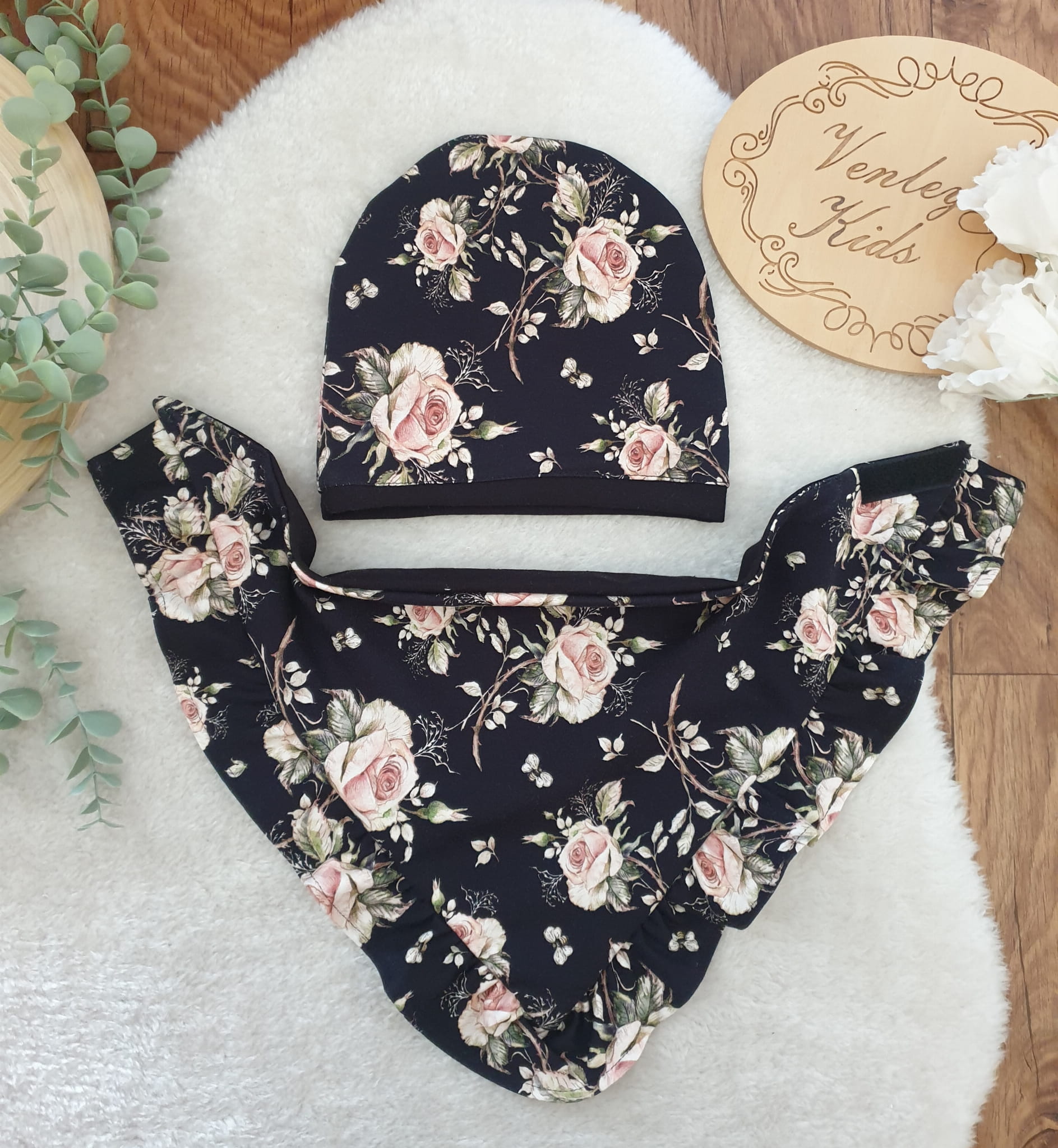 RÓŻE NA CIEMNYM zestaw czapka z chustą