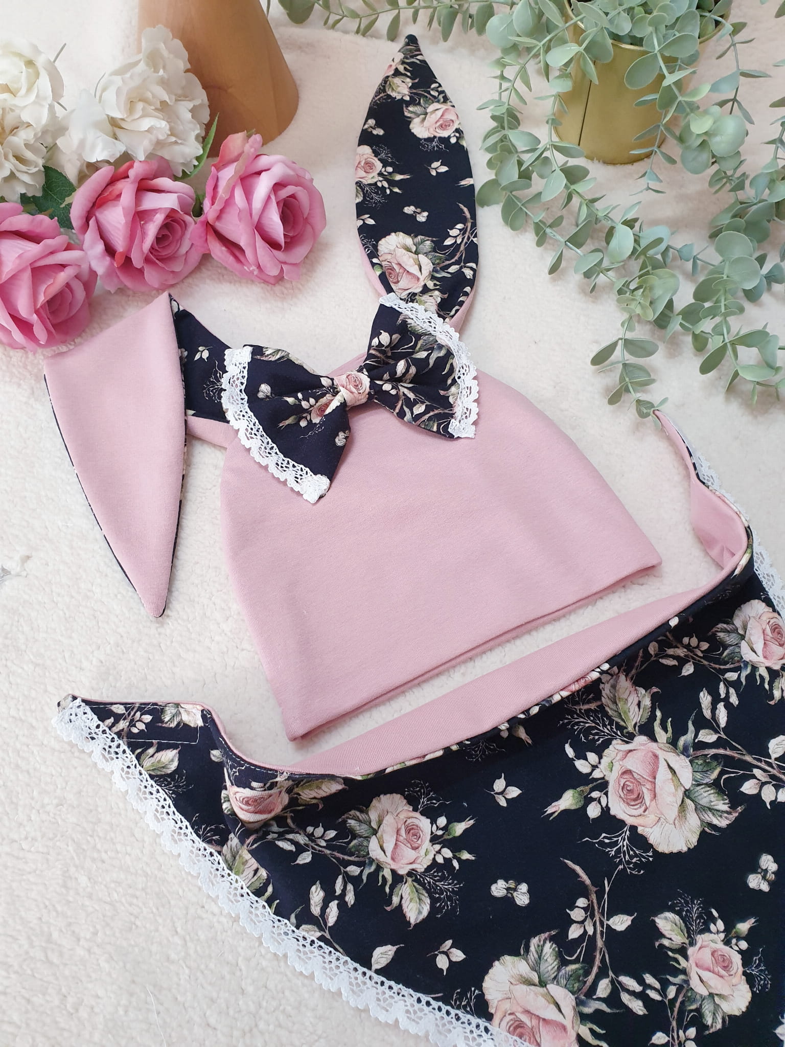 Róże na pudrze zestaw z koronką królik