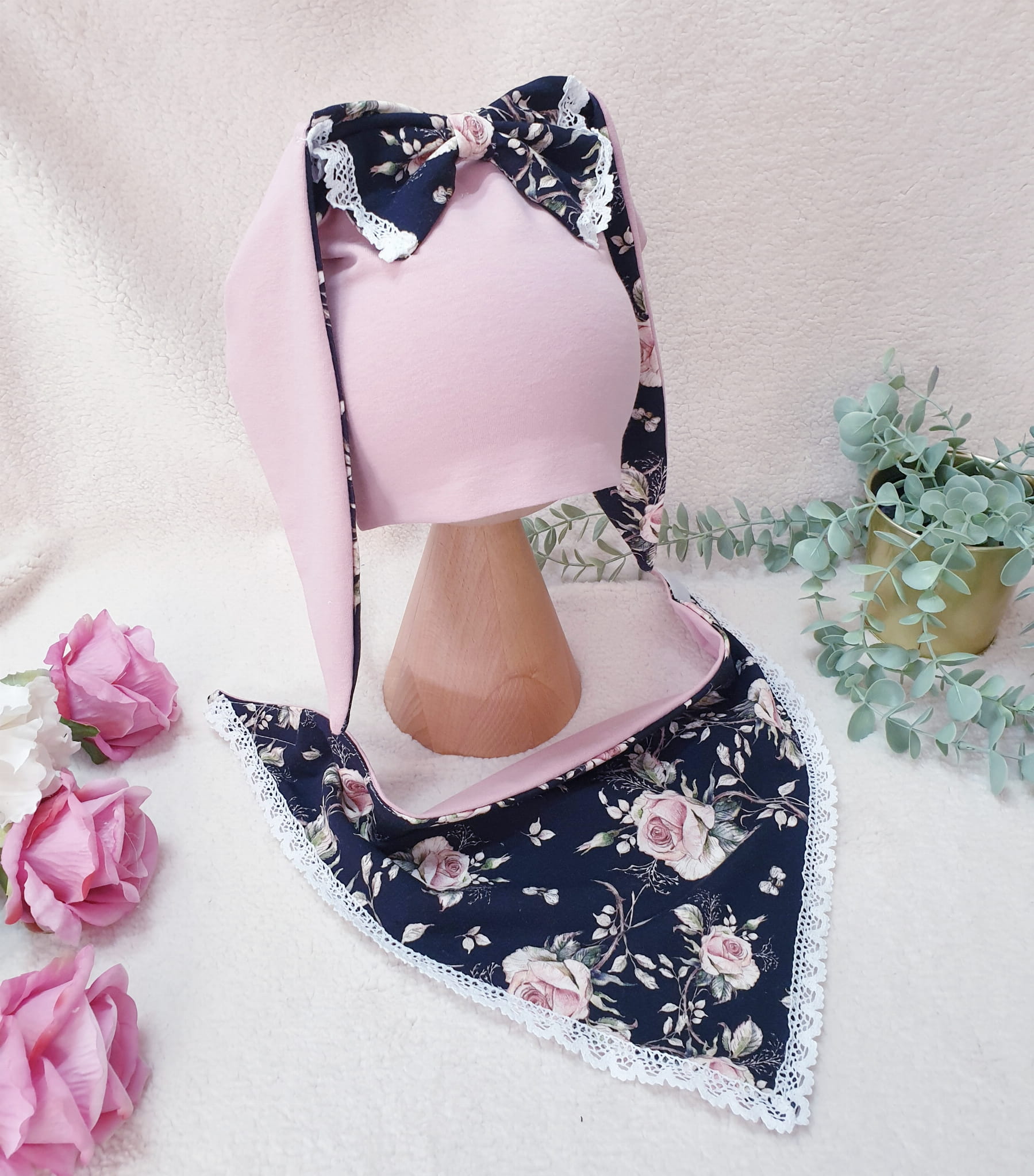 Czapeczka z uszami królika, kokardka z koronką