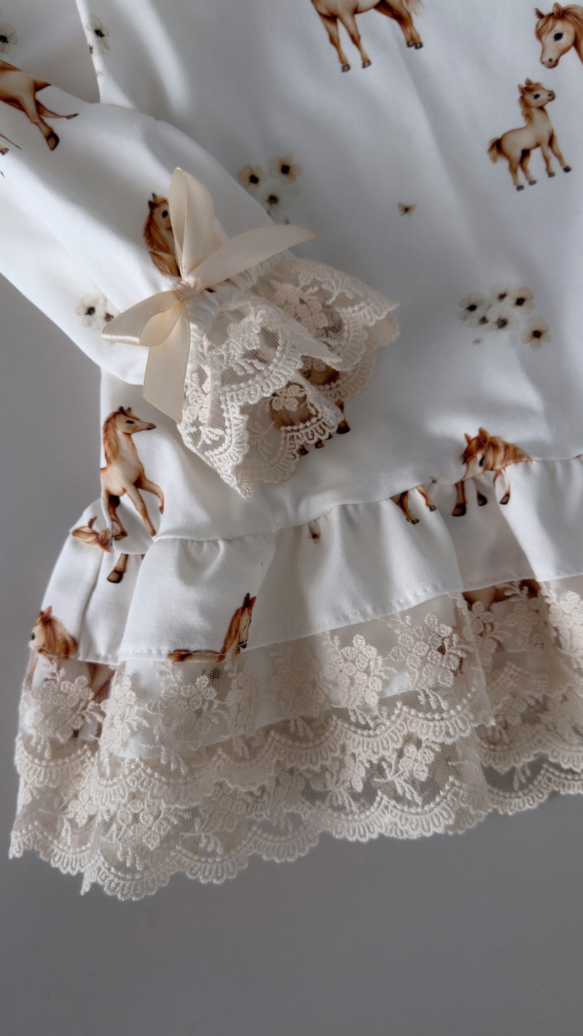 Sukienka rozkloszowana , z długim rękawkiem i falbanką , ozdabiana koronką