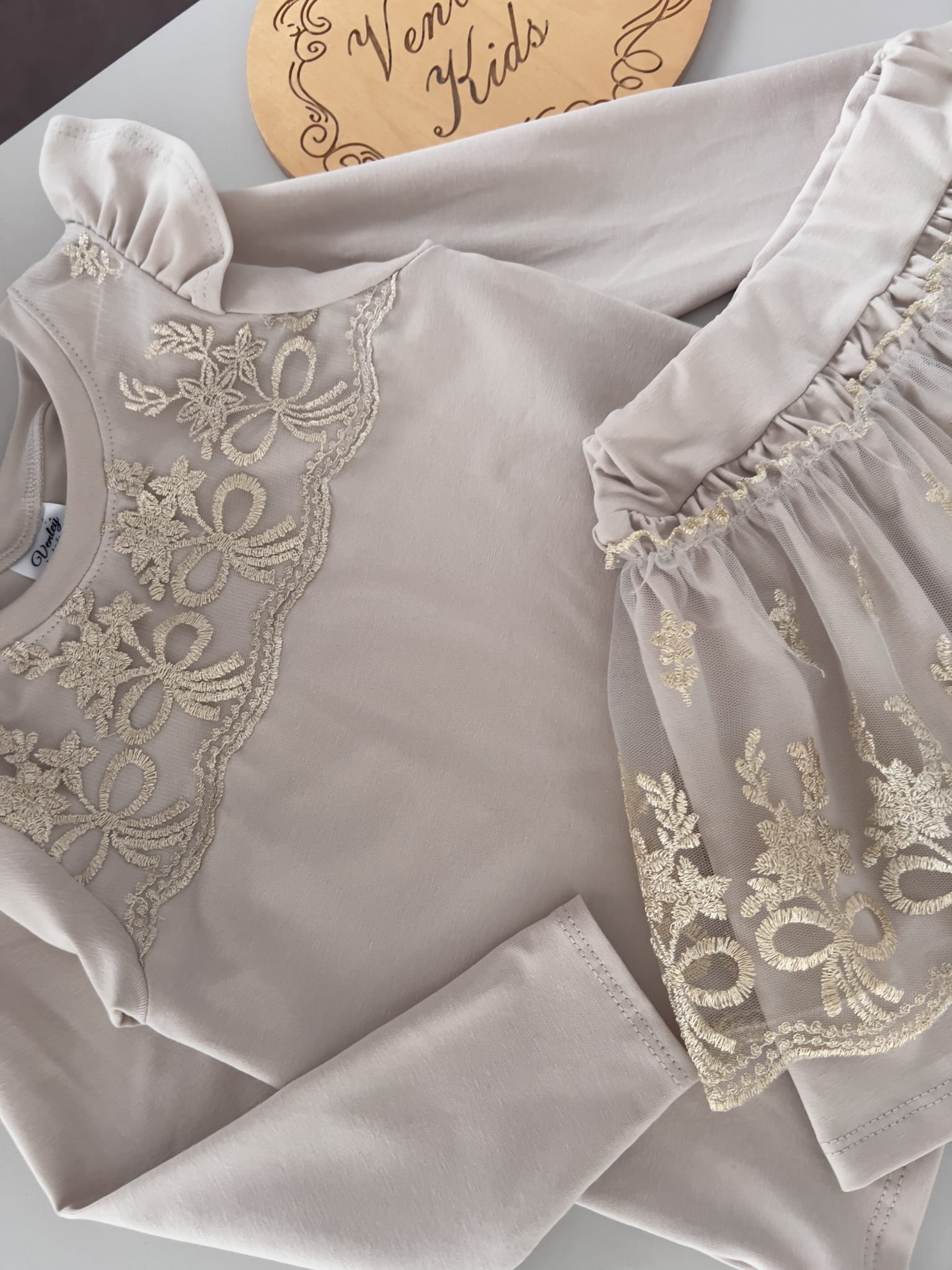 Body lub bluzeczka na długi rękawek z falbanką, na przodzie koronka na tiulu