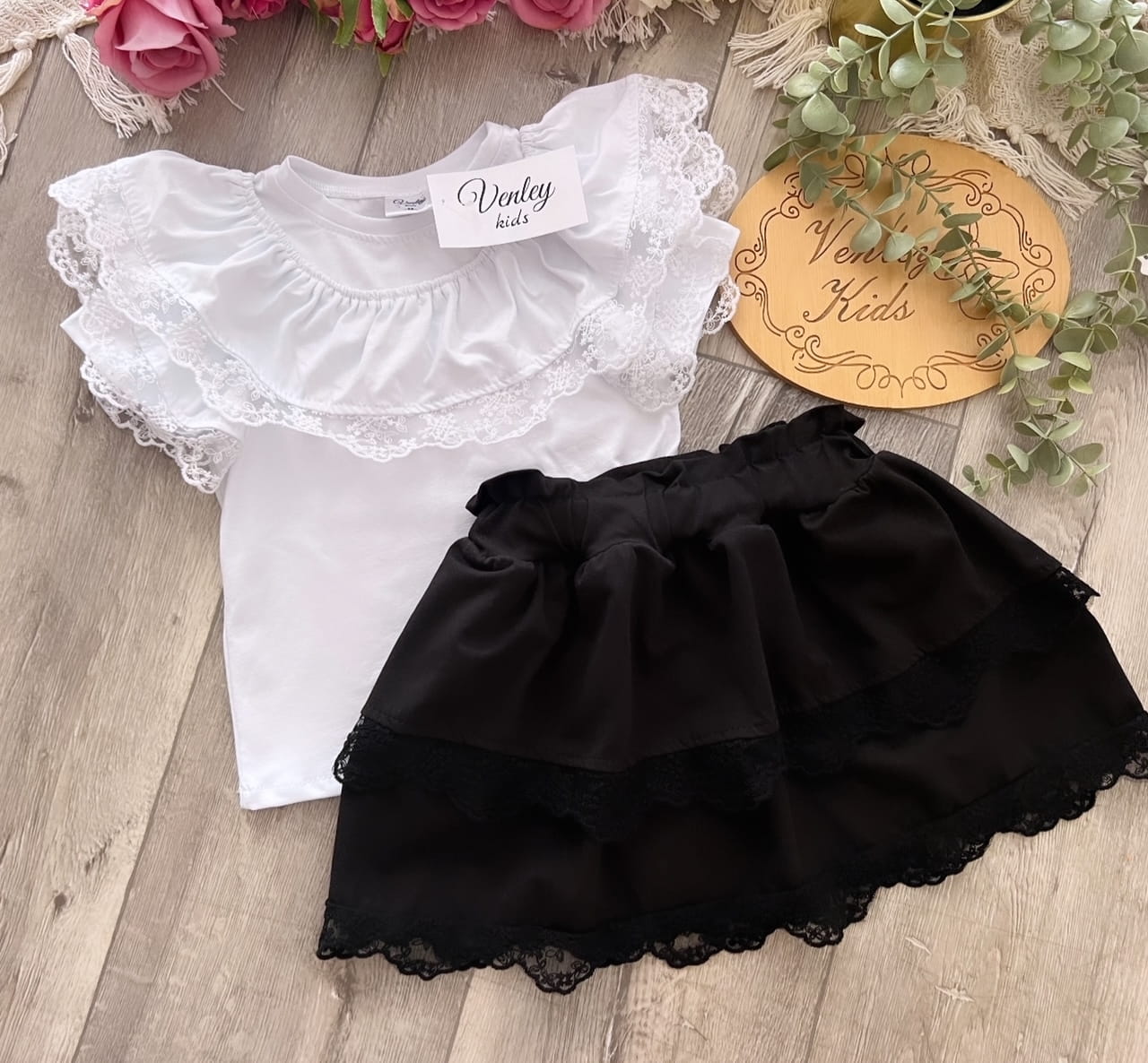 Bluzeczka na krótki rękawek z falbanką na ramionach i w kształcie U , obie z przepiękną koronką na tiulu