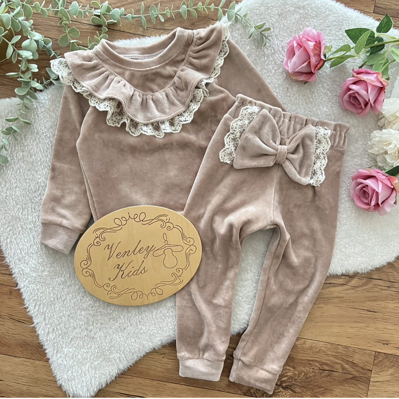 Zestaw welur brąz z koronka tiul beż