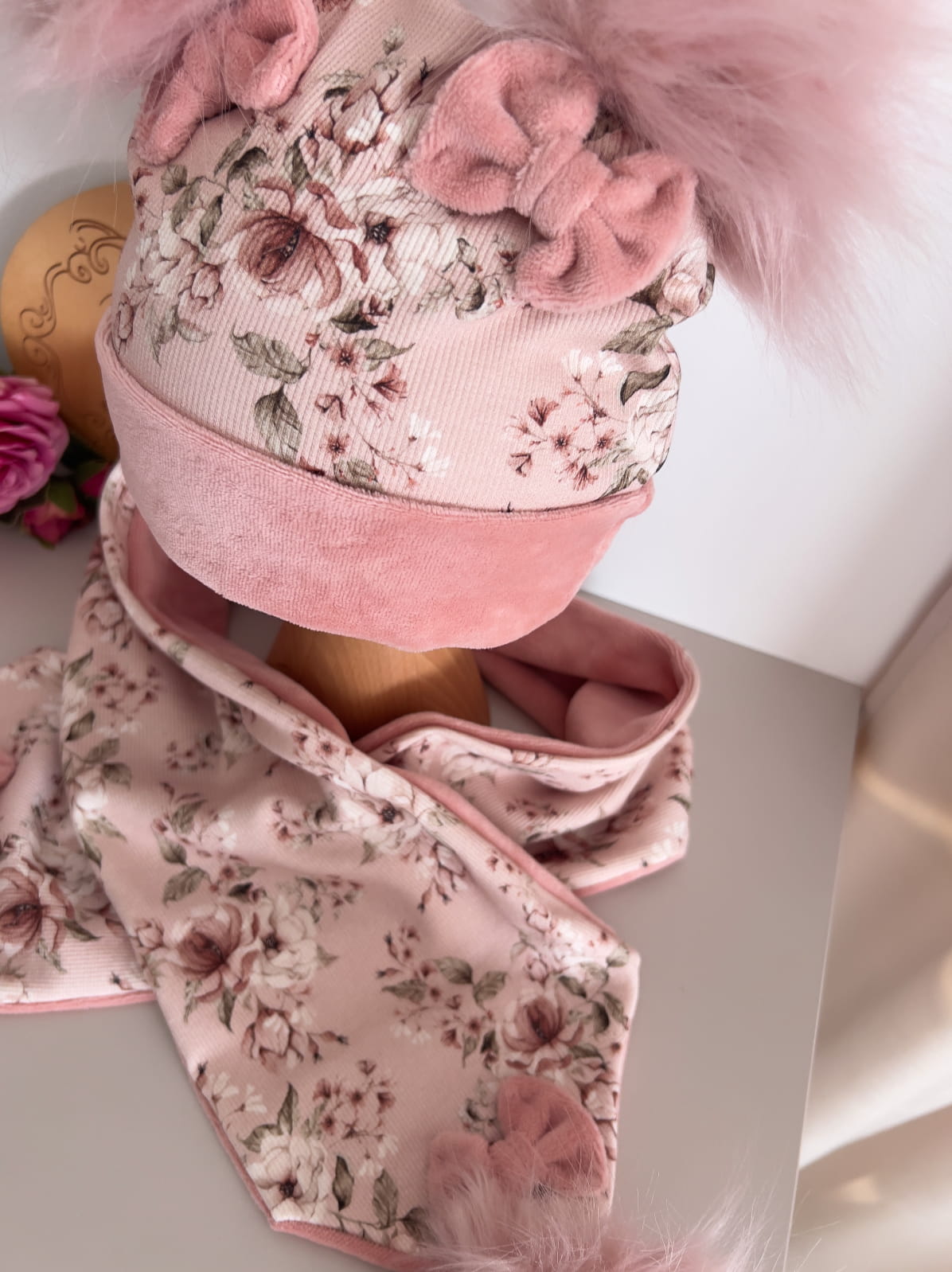 Czapeczka z podwójnego materiału ( dzianina + welurek) z 2 pomponikami i kokardkami